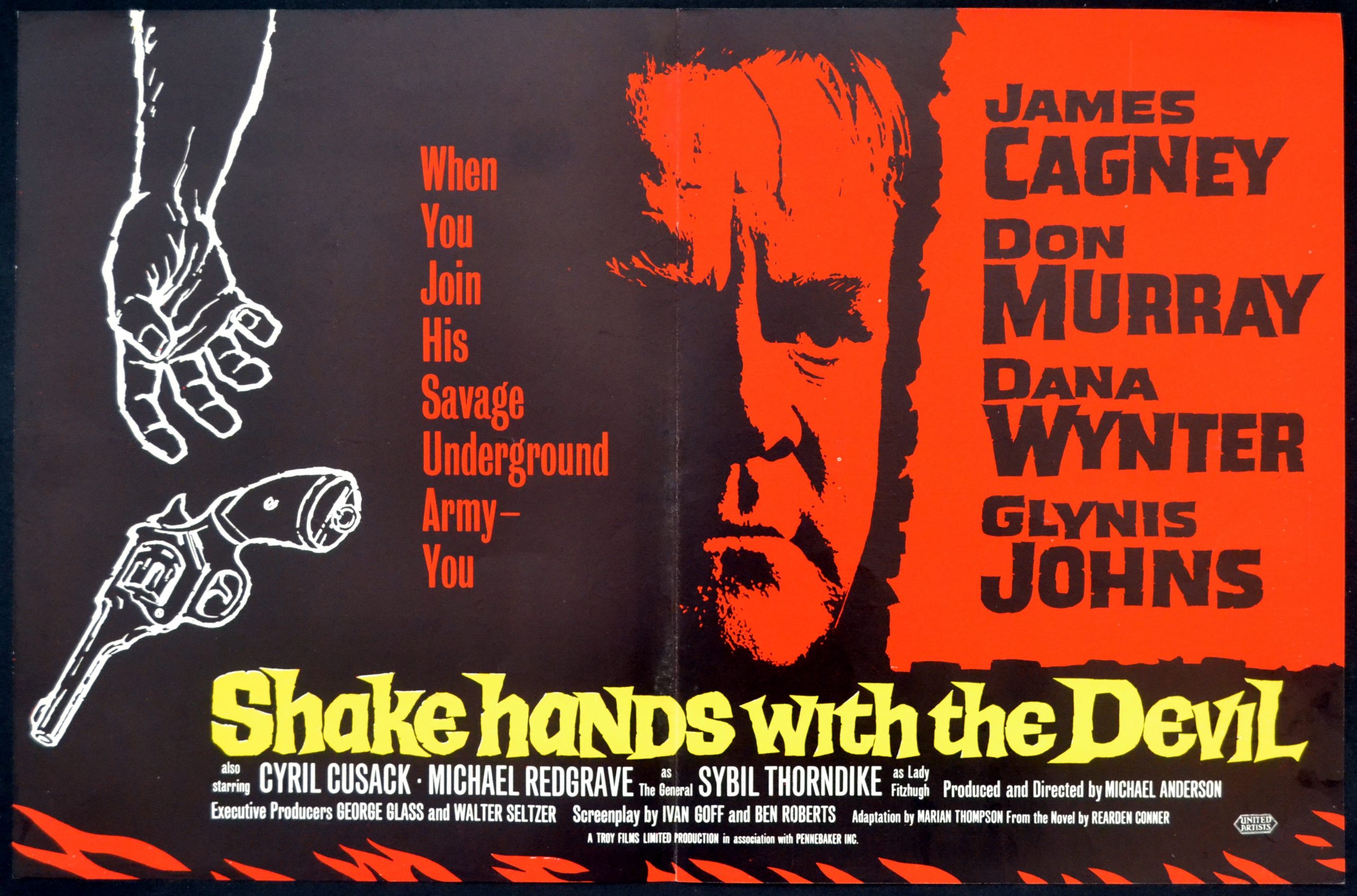 Original British 11 inch x 17 inch Trade Advertisement from Kinematograph Weekly for the 1959 Michael Anderson Drama SHAKE HANDS WITH THE DEVIL, based on the novel by Rearden Conner and starring James Cagney, Don Murray, Dana Wynter, Glynis Johns, Cyril Cusack, Michael Redgrave and Sybil Thorndike.
