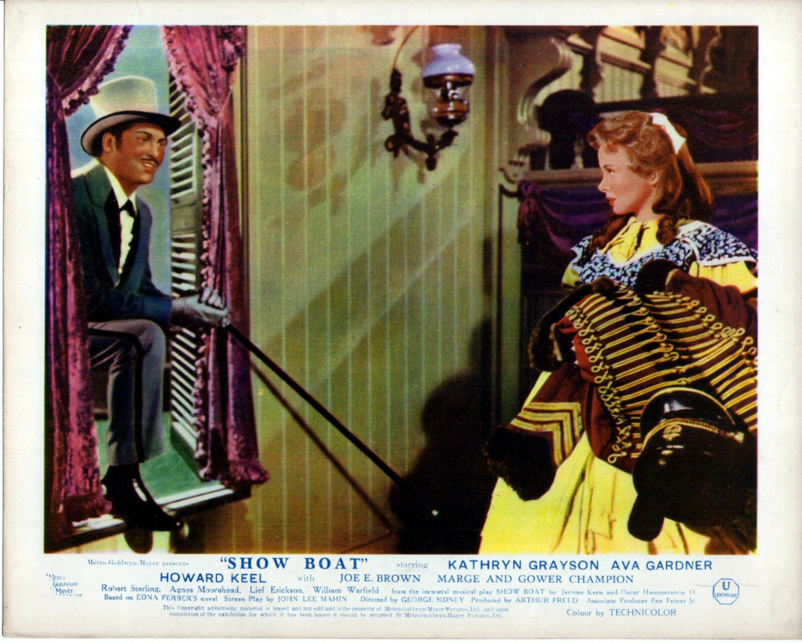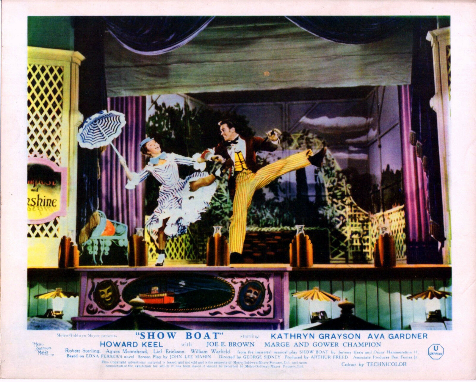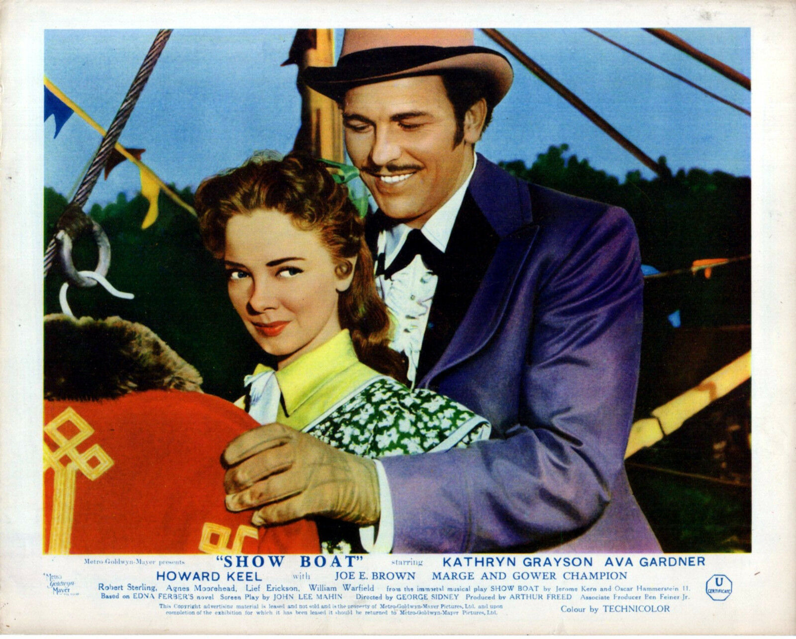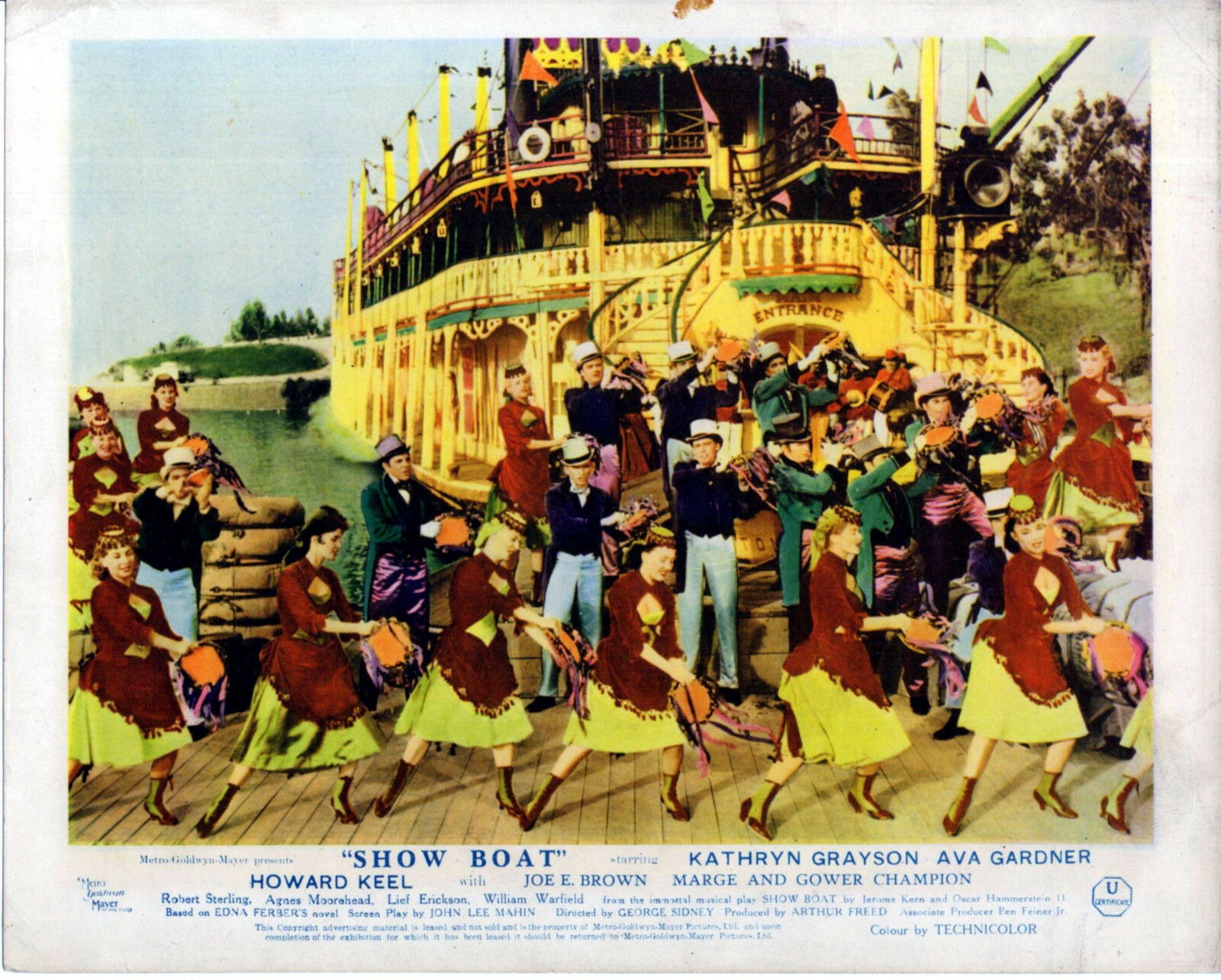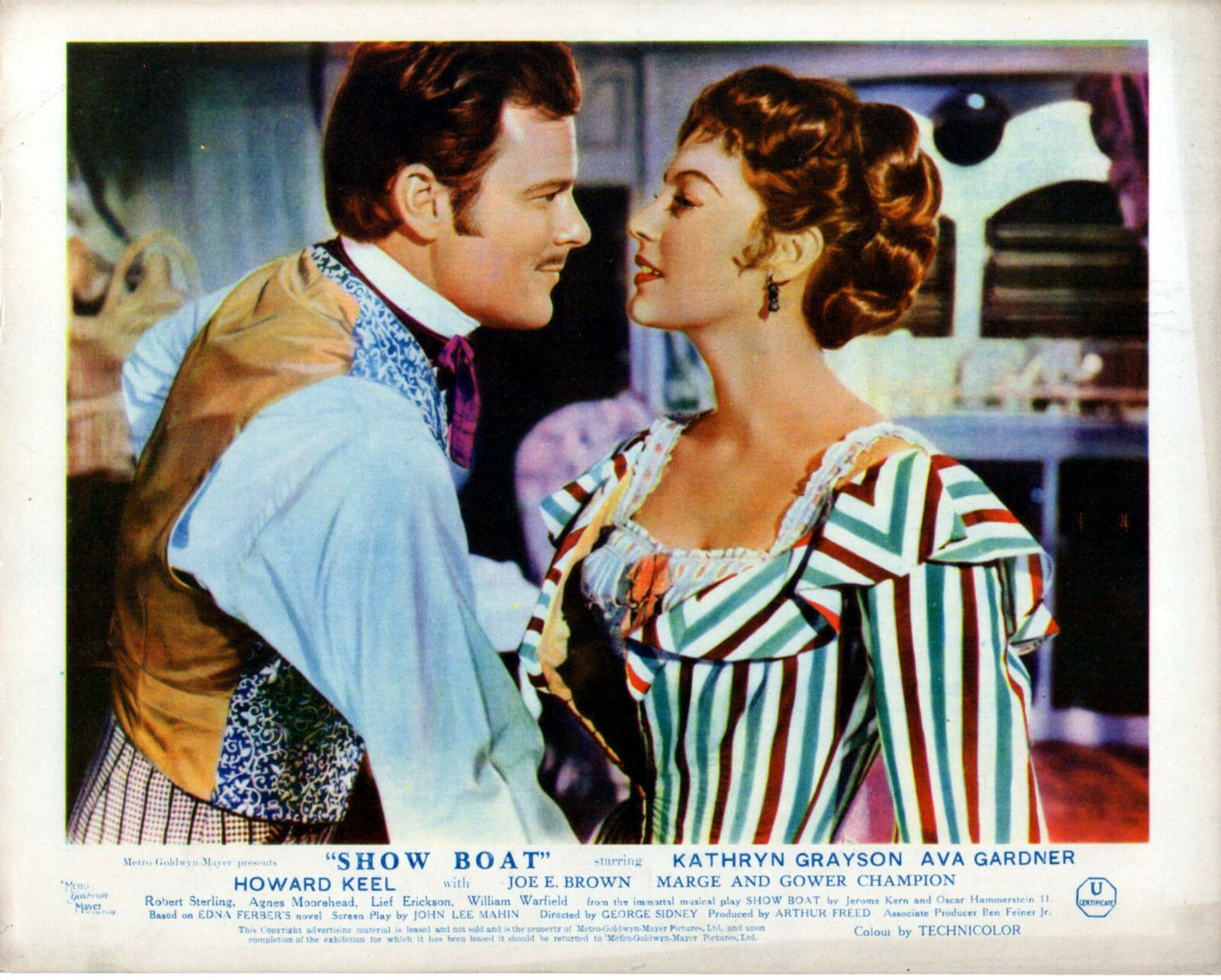 5 Original British 10 inch by 8 inch Front-of-House Stills (Lobby Cards) for the 1951 George Sidney Musical SHOW BOAT, based on the novel by Edna Ferber and starring Howard Keel, Kathryn Grayson, Ava Gardner, Robert Sterling, Marge and Gower Champion.