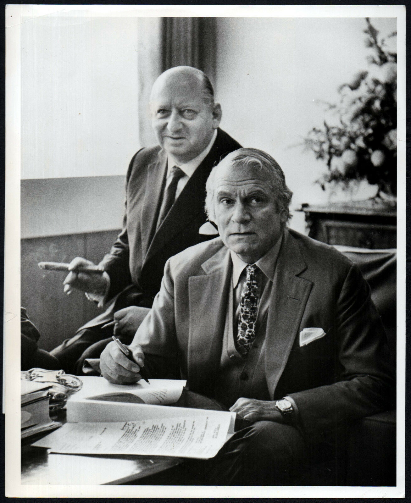 Original 10 inch x 8 inch Black and White Still of LORD LAURENCE OLIVIER signing a TV contract in the early 1970s with SIR LEW GRADE.