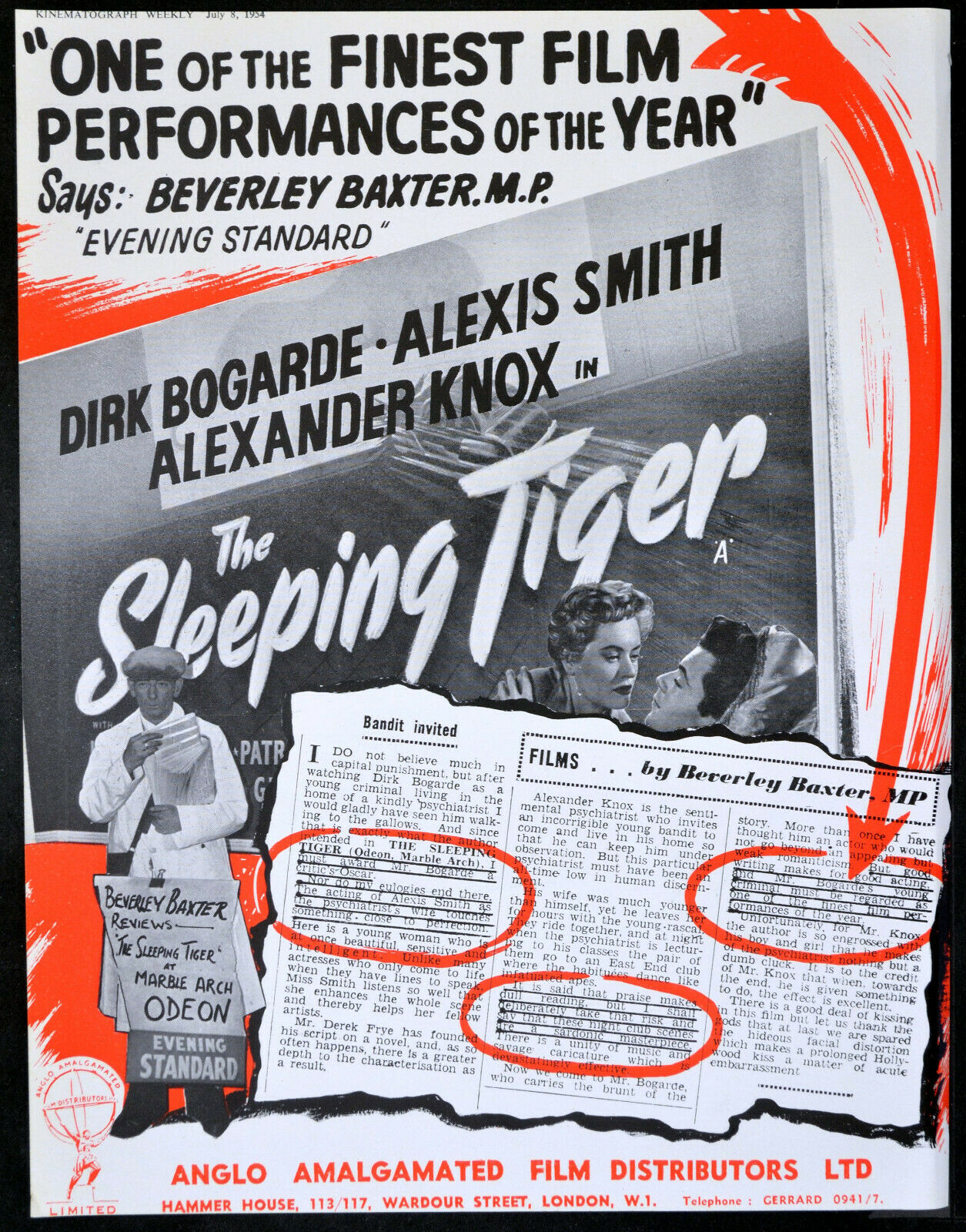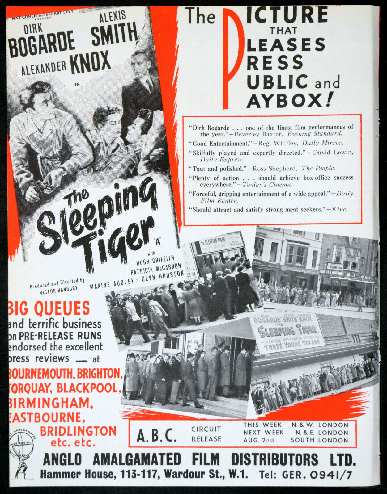 2 Original British 10 3/4 inch x 8 1/4 inch Trade Advertisements from Kinematograph Weekly for the 1954 Joseph Losey Thriller THE SLEEPING TIGER, based on the novel by Maurice Moiseiwitsch and starring Dirk Bogarde, Alexis Smith, Alexander Knox, Hugh Griffith, Patricia McCarron, Maxine Audley, Glyn Houston, Harry Towb, Russell Waters, Billie Whitelaw and Esma Cannon.