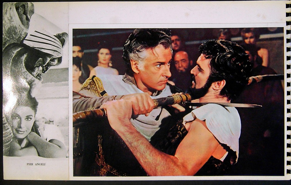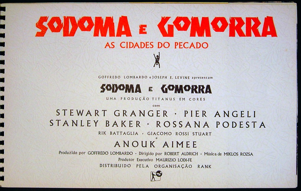 Original Italian 11 3/4 inch x 18 3/4 inch 34 Page Fully Illustrated Spiral-Bound Brochure for the 1962 Robert Aldrich Drama SODOM AND GOMORRAH, based on the novel by Richard Wormser and starring Stewart Granger, Pier Angeli, Stanley Baker, Rossana Podestà, Rik Battaglia, Giacomo Rossi Stuart, Scilla Gabel, Anthony Steffen, Enzo Fiermonte, Gabriele Tinti, Daniele Vargas, Claudia Mori, Feodor Chaliapin Jr. and Anouk Aimée .