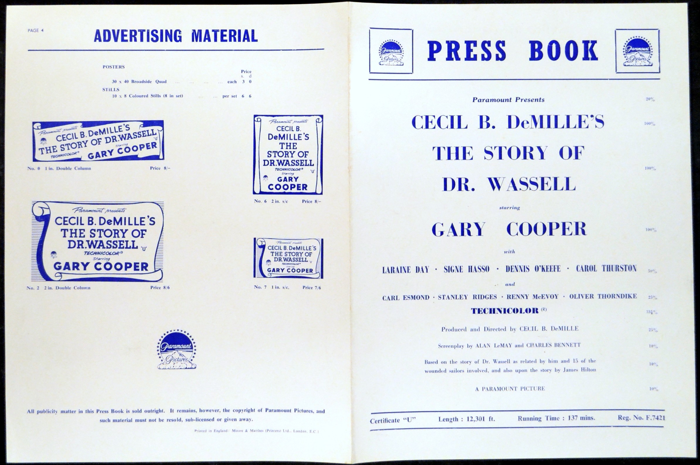 Original British 11 1/4 inch x 8 1/2 inch 4 page illustrated Pressbook for the 1944 Cecil B. DeMille World War II Biography THE STORY OF DR. WASSELL starring Gary Cooper as Dr. Corydon M. Wassell, Laraine Day, Signe Hasso, Dennis O’Keefe, Carol Thurston, Carl Esmond, Stanley Ridges, Renny McEvoy Oliver Thorndike.