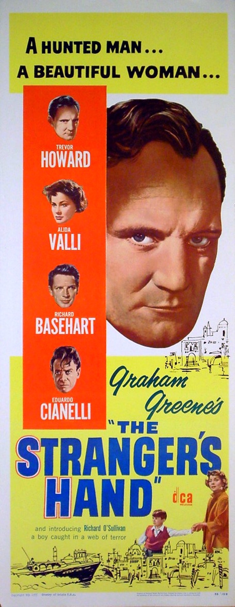 Original 1955 U.S. 14 inch x 36 inch Insert Poster for the 1954 Mario Soldati Thriller STRANGER’S HAND (LA MANO DELLO STRANIERO), based on a story by Graham Greene and starring Trevor Howard, Alida Valli, Richard Basehart, Eduardo Ciannelli, Stephen Murray, Richard O’Sullivan, Arnoldo Foà, Guido Celano, Helen Goss, Giorgio Costantini, Angelo Cecchelin, Nino Vechina, Armando Papette, Giovanni Karuz, Joan Butterfield, Alessandro Paulon, Remington Olmsted and Jacopo Tecchi.