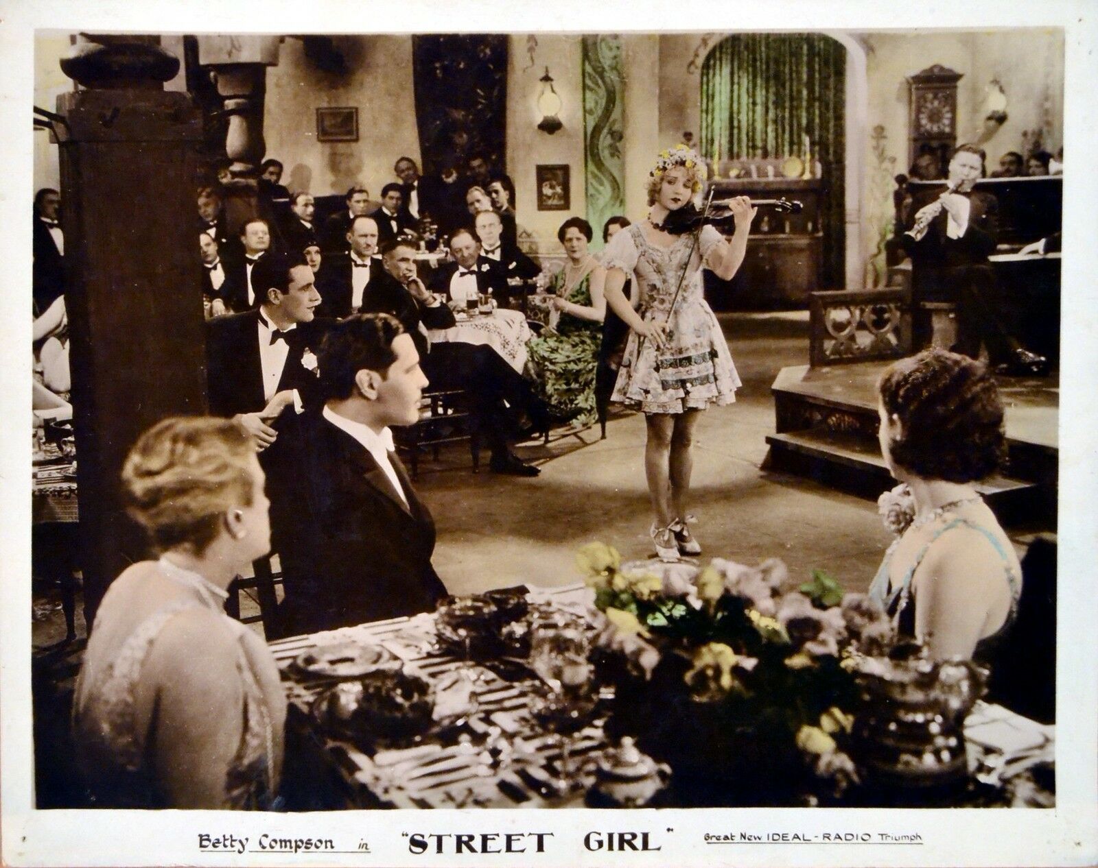 Original 11 inch x 14 inch British Lobby Card of BETTY COMPSON with IVAN LEBEDEFF seated in the 1929 Wesley Ruggles Romantic Drama STREET GIRL, based on the story “The Viennese Charmer” by W. Carey Wonderly