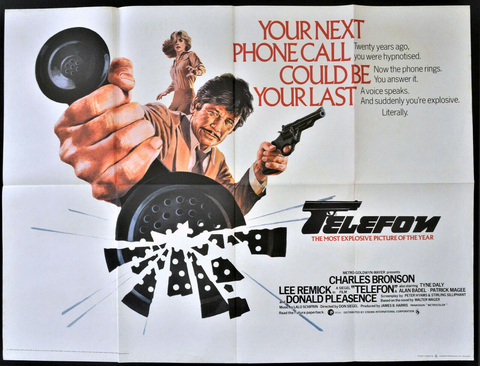 Original British 30 inch x 40 inch Quad Poster for the 1977 Don Siegel Thriller TELEFON, based on the novel by Walter Wager and starring Charles Bronson, Lee Remick, Tyne Daly, Alan Badel, Patrick Magee and Donald Pleasence.