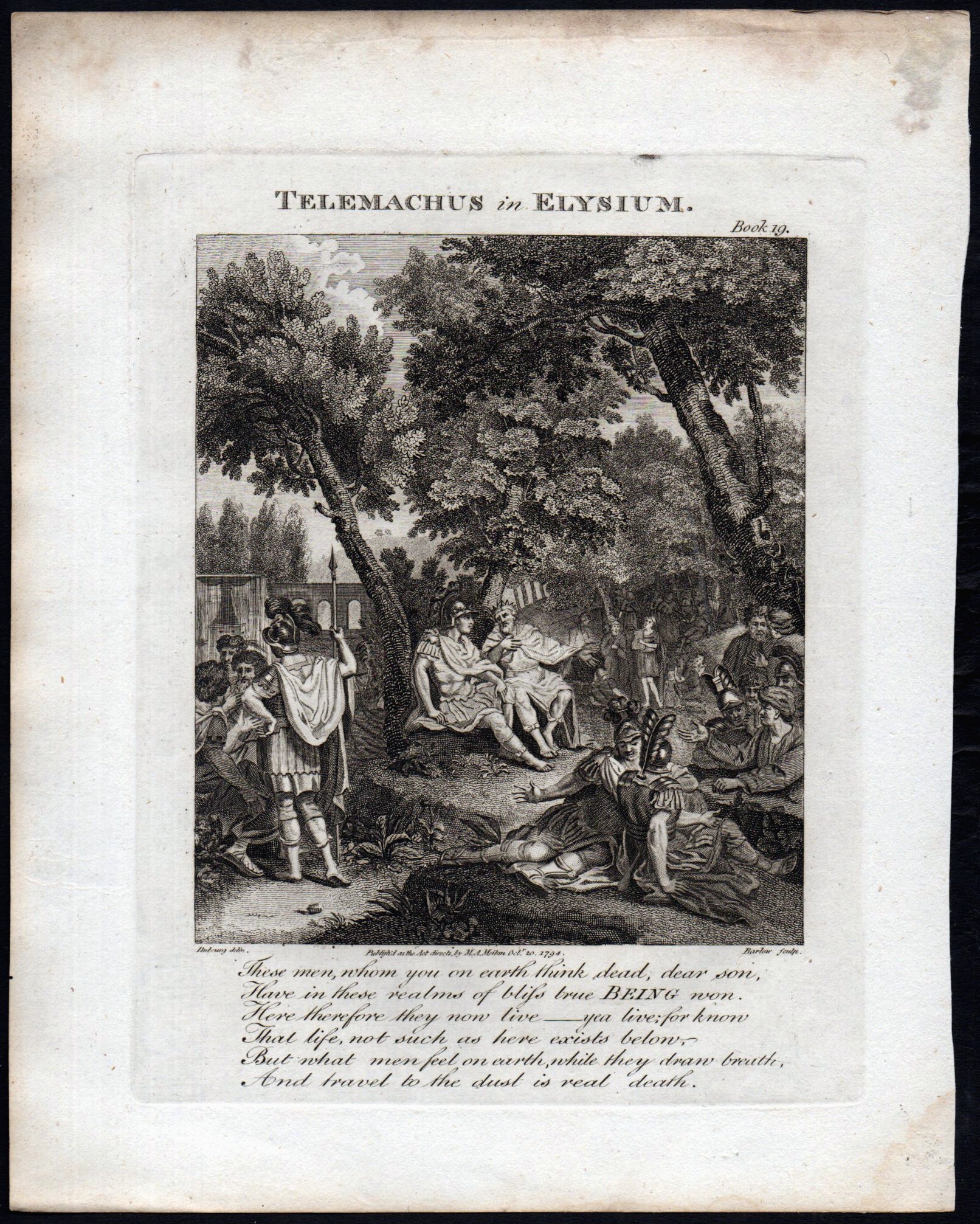 Original 1794 10 inch x 7 3/4 inch etching and engraving titled TELEMACHUS IN ELYSIUM.