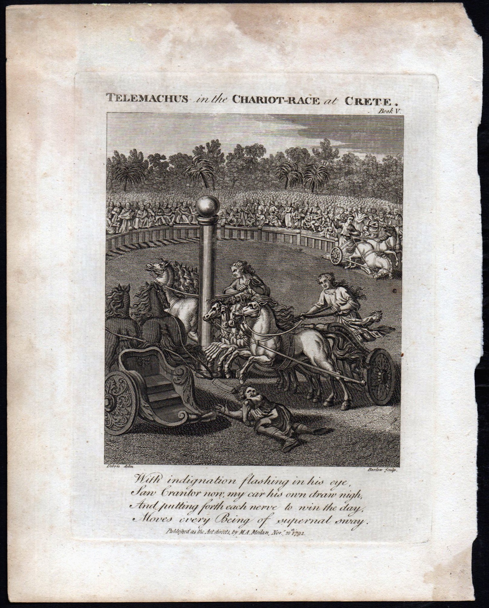 Original 1792 10 inch x 7 3/4 inch etching and engraving titled TELEMACHUS IN THE CHARIOT RACE AT CRETE.