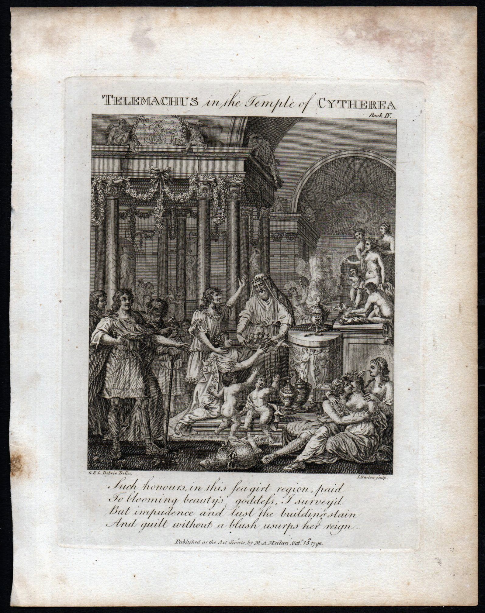 Original 1792 10 inch x 7 3/4 inch etching and engraving titled TELEMACHUS IN THE TEMPLE OF CYTHEREA.