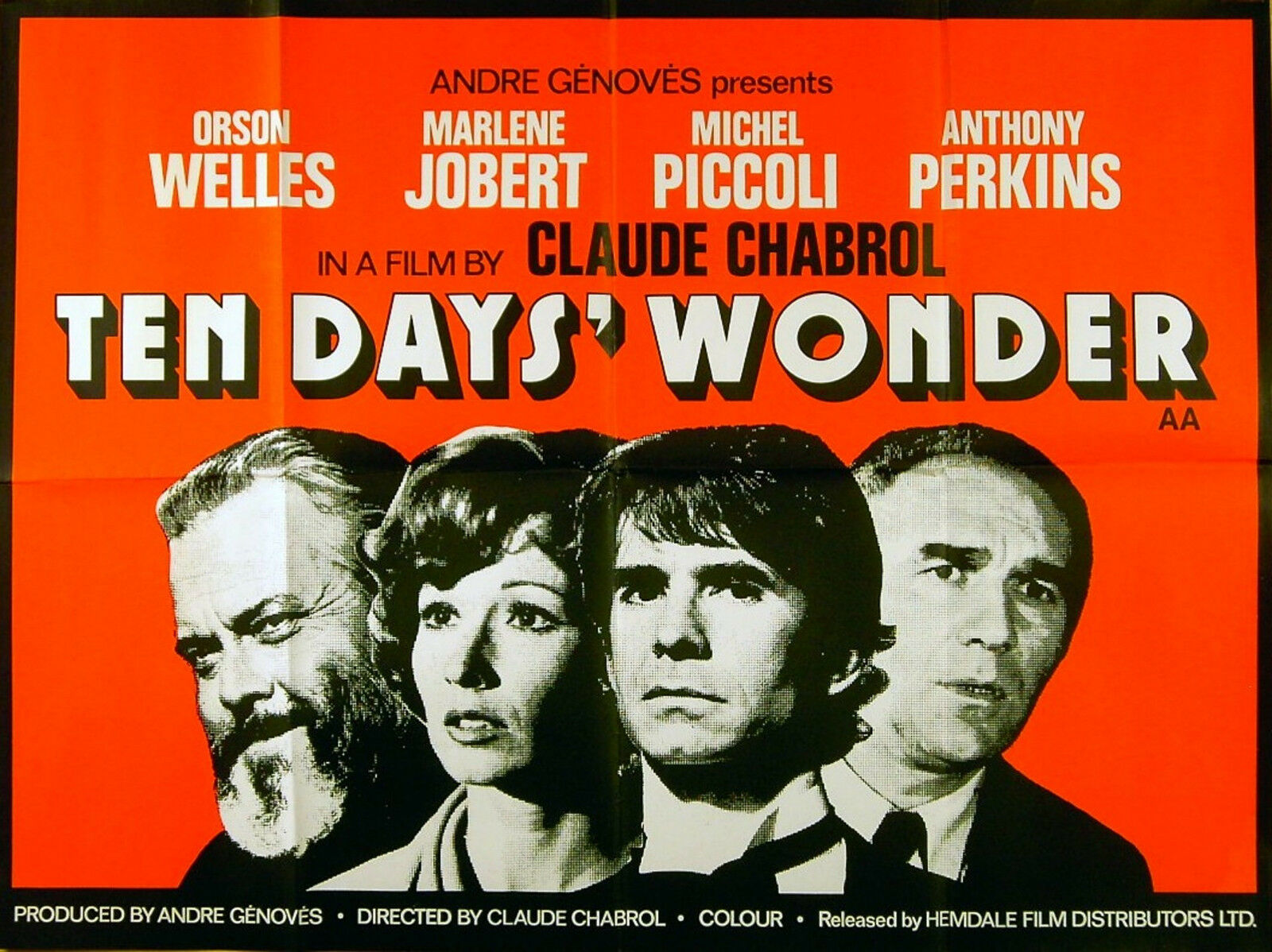 Original British 30 inch x 40 inch Quad Poster for the 1971 Claude Chabrol Mystery TEN DAYS WONDER (LA DECADE PRODIGIEUSE), based on the novel by Frederic Dannay (Ellery Queen) and starring Orson Welles, Marlene Jobert, Michel Piccoli and Anthony Perkins.
