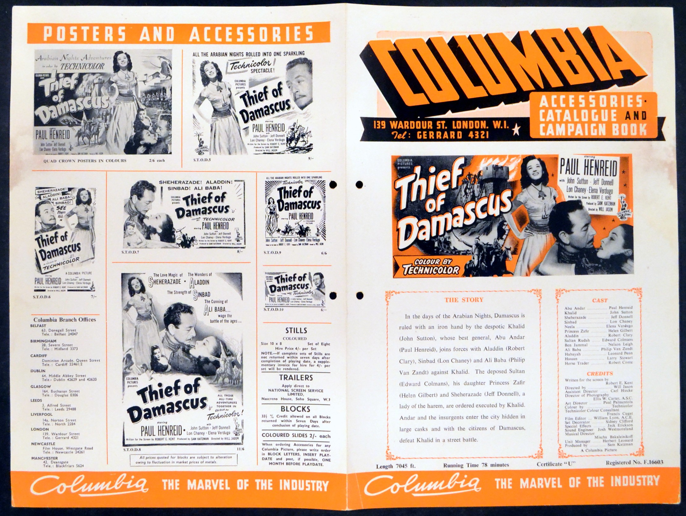 Original British 14 1/2 inch x 9 3/4 inch 6 page illustrated Campaign Book for the 1952 Will Jason Arabian Adventure THE THIEF OF DAMASCUS, based on the novel by Glendon Swarthout and starring Paul Henreid, John Sutton, Jeff Donnell as Sheherazade, Lon Chaney Jr. as Sinbad, Elena Verdugo, Robert Clary as Aladdin, and Philip Van Zandt as Ali Baba.