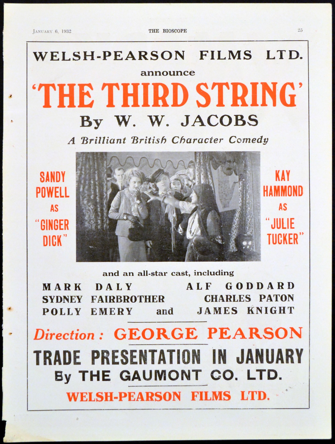 FONT COLOR=OLIVE>Original British 12 1/4 inch x 9 inch Trade Advertisement for the 1932 George Pearson Comedy THE THIRD STRING starring Sandy Powell, Kay Hammond, Mark Daly, Alf Goddard, Charles Paton, Sydney Fairbrother, Polly Emery and James Knight.
