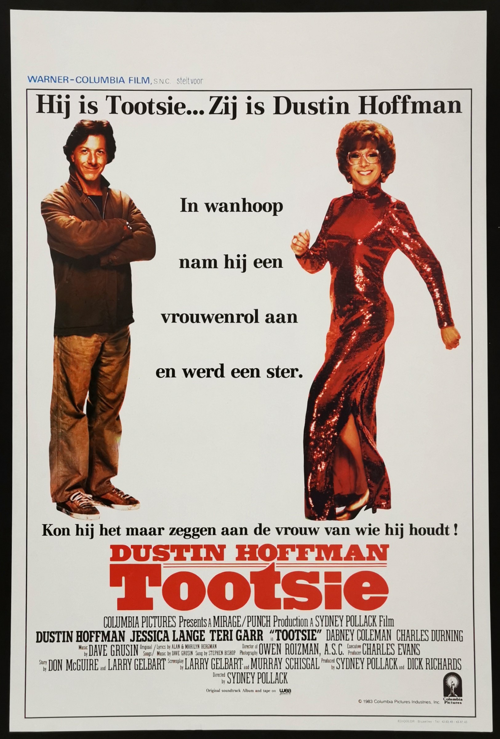 Original Belgian 14 1/2 inch x 21 5/8 inch Poster for the 1982 Sydney Pollack Comedy TOOTSIE starring Dustin Hoffman, Jessica Lange, Teri Garr, Dabney Coleman, Charles Durning, Bill Murray, Sydney Pollack, George Gaynes and Geena Davis.