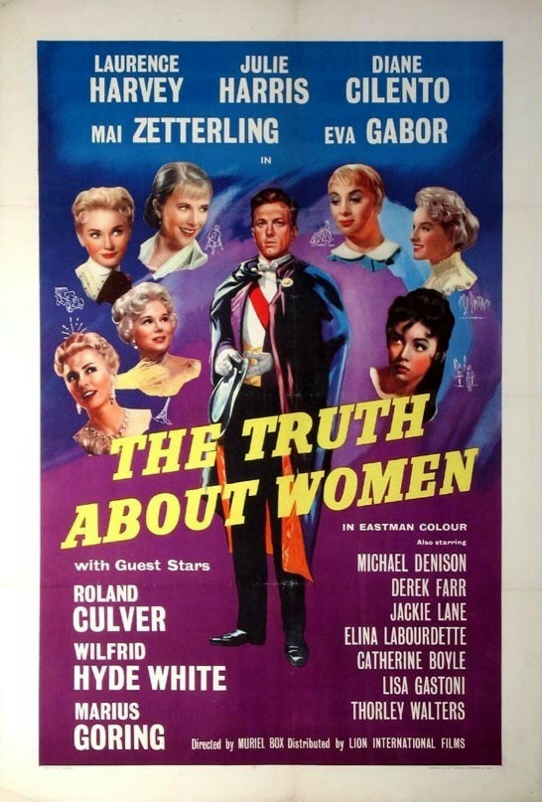Original British 27 inch x 40 inch 1-Sheet Poster for the 1957 Muriel Box Drama THE TRUTH ABOUT WOMEN starring Laurence Harvey, Julie Harris, Diane Cilento, Mai Zetterling, Eva Gabor, Michael Denison, Derek Farr, Roland Culver, Wilfrid Hyde White and Christopher Lee.