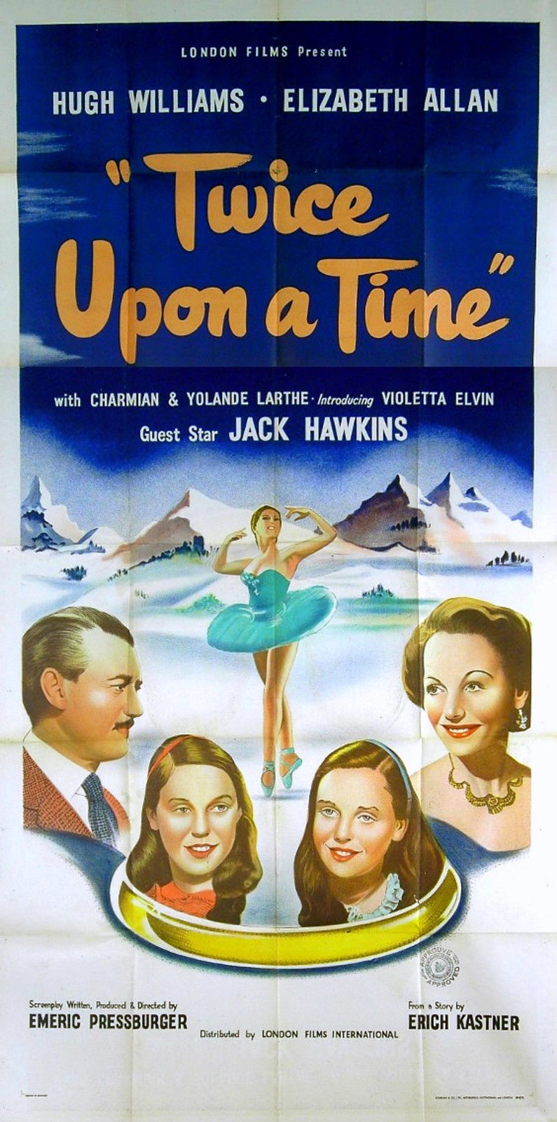 Original British 40 inch by 81 inch 3-Sheet Poster for the 1953 Emeric Pressburger Comedy TWICE UPON A TIME, based on the novel by Erich Kästner and starring Hugh Williams, Elizabeth Allan, Jack Hawkins, Yolande Larthe, Charmaine Larthe, Isobel Dean, Michael Gough and Walter Fitzgerald.