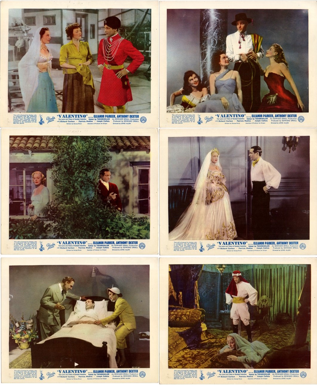 6 Original British 10 inch by 8 inch Front-of-House Stills (Lobby Cards) of ANTHONY DEXTER as Rudolph Valentino and ELEANOR PARKER, PATRICIA MEDINA, DONA DRAKE & LLOYD GOUGH in the 1951 Lewis Allen Drama VALENTINO, based on the story “Valentino As I Knew Him” by George Bruce