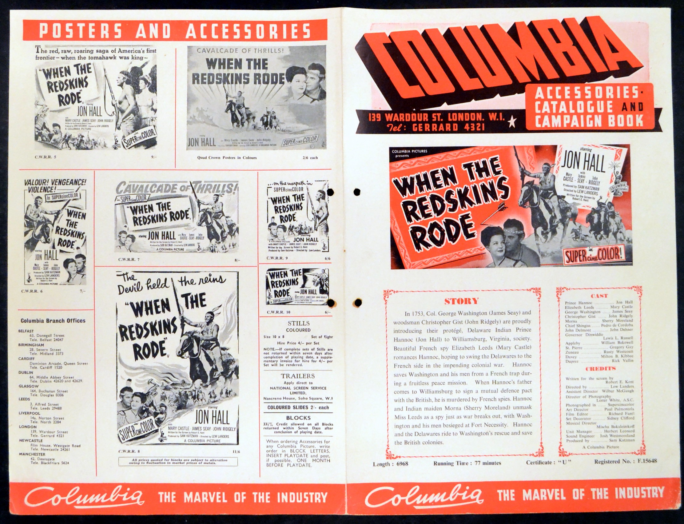 Original British 14 1/2 inch x 9 5/8 inch 4 page illustrated Campaign Book for the 1951 Lew Landers Western WHEN THE REDSKINS RODE starring Jon Hall, Mary Castle, James Seay, John Ridgely and Sherry Moreland.
