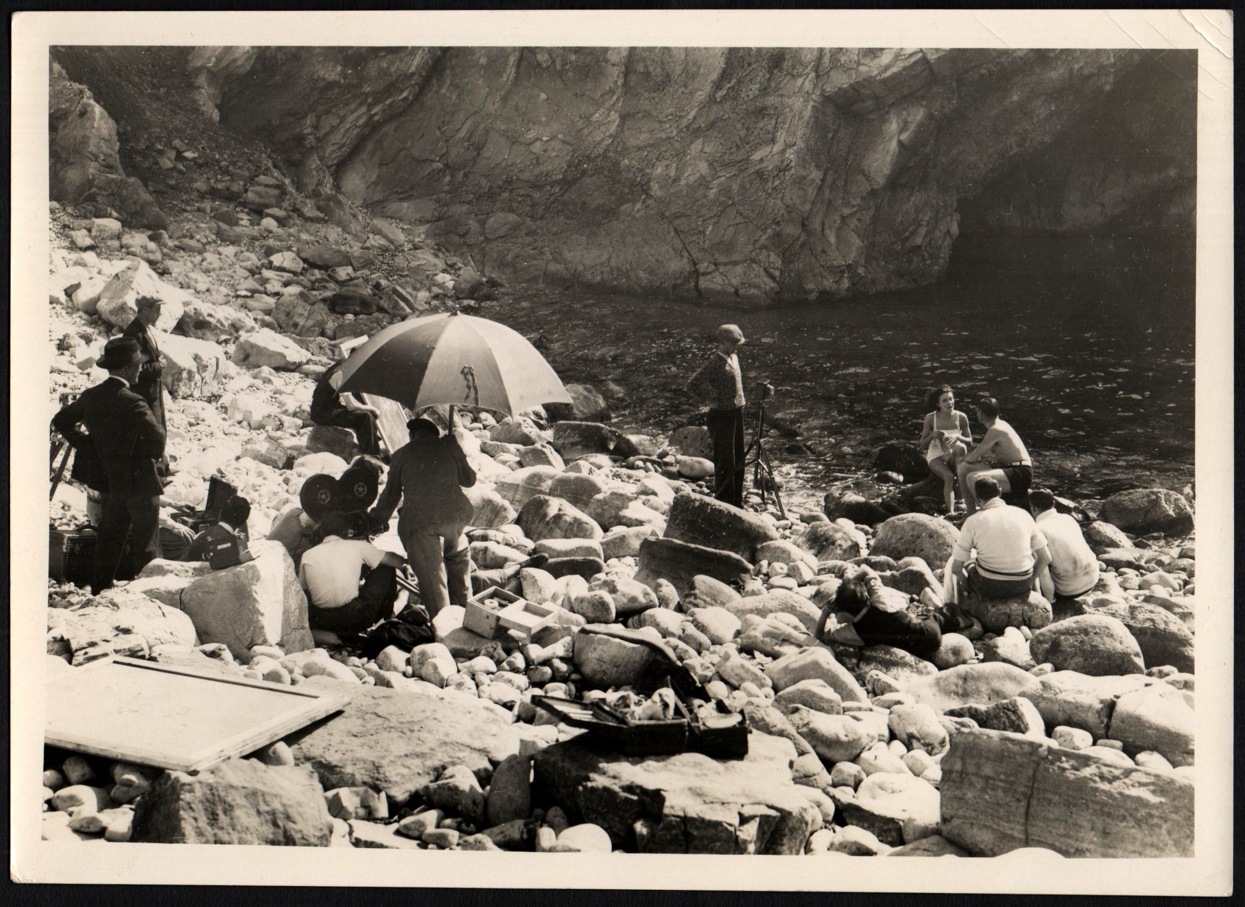 Original 9 1/2 inch x 6 3/4 inch Black and White Still of ANTHONY KIMMINS & MOLLY LAMONT seated on a rock with director JOHN HUNT and film crew shooting a scene, on location in Weymouth, for his 1934 Adventure WHITE ENSIGN.