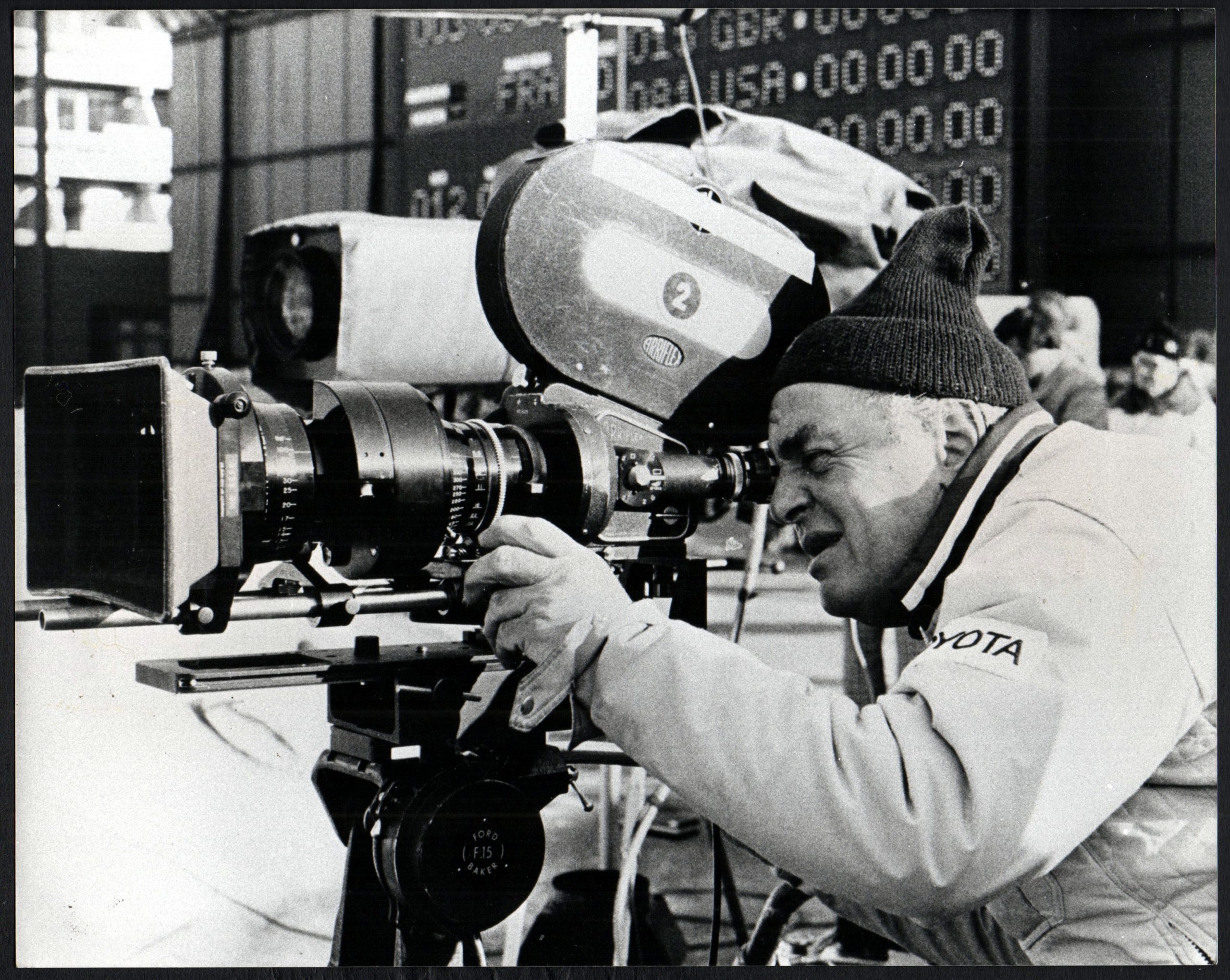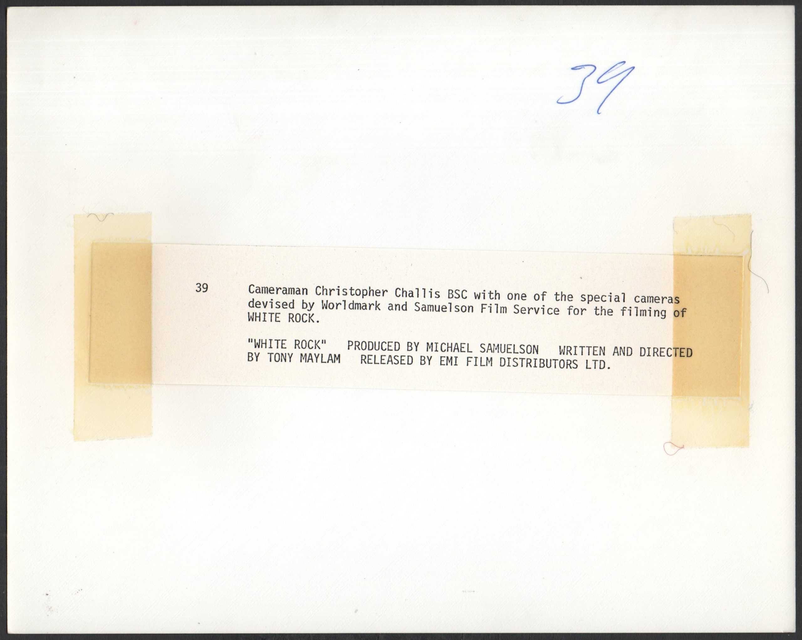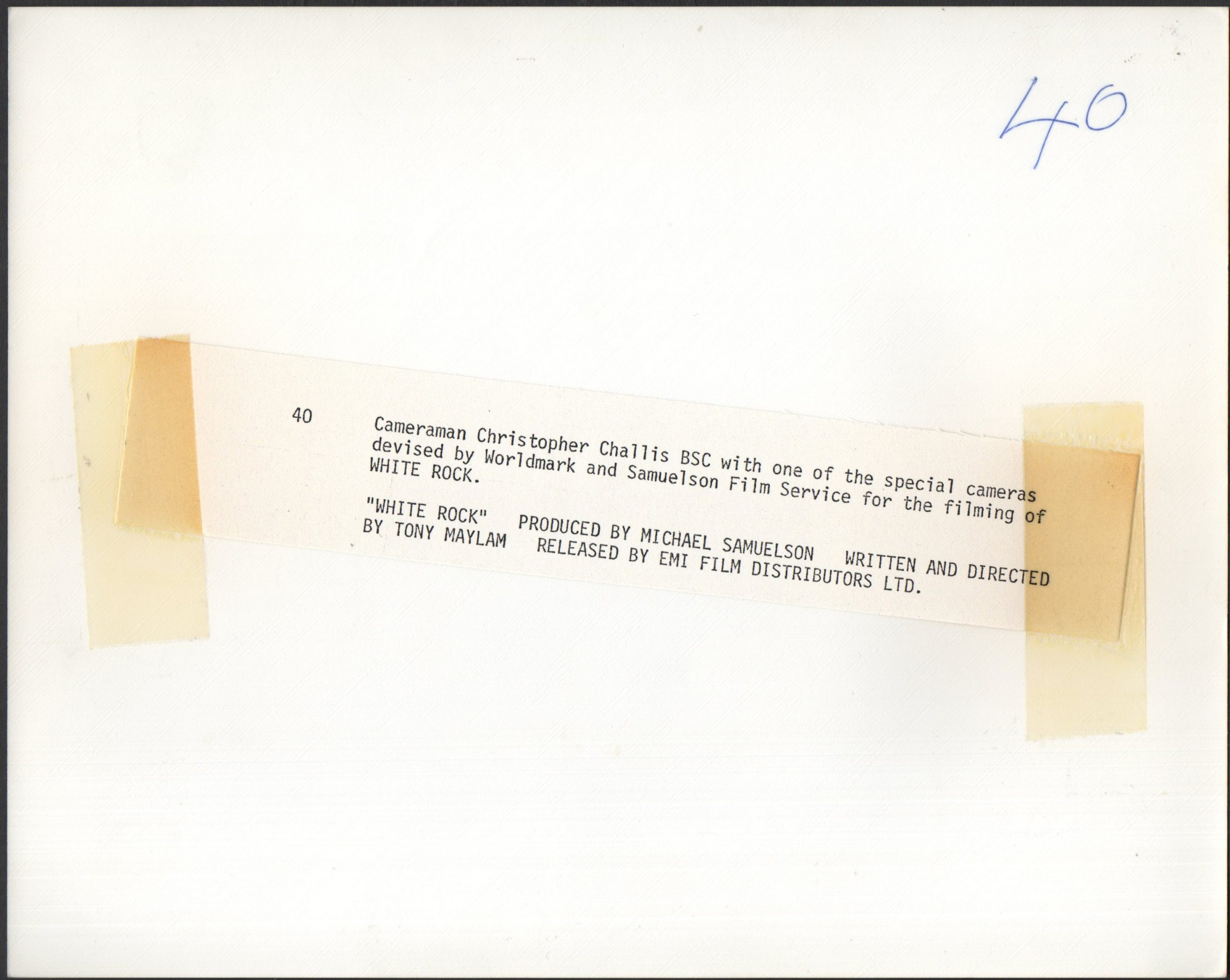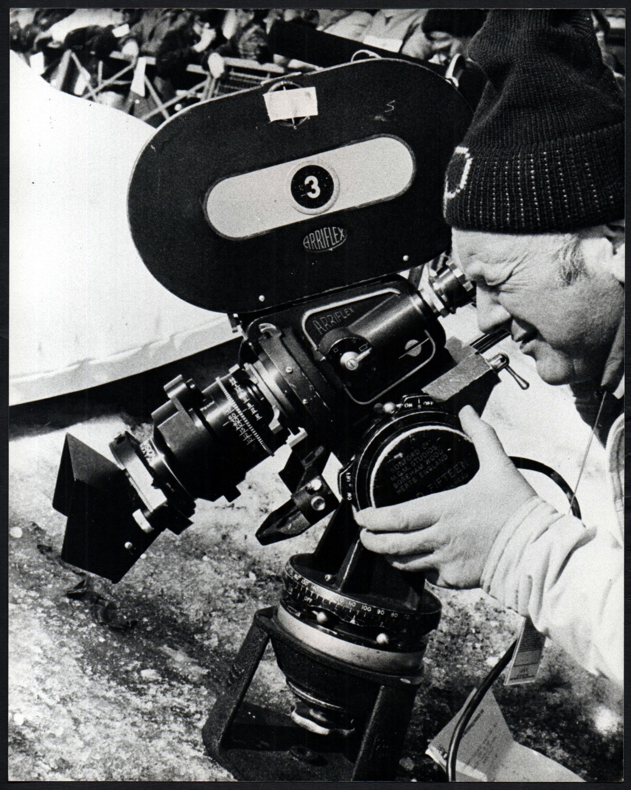 2 Original 10 inch x 8 inch Stills of Cinematographer CHRISTOPHER CHALLIS using a special camera devised by Worldmark and Samuelson Film Service for the 1977 Tony Maylam Documentary WHITE ROCK about the Winter Olympics in Innsbruck 1976.