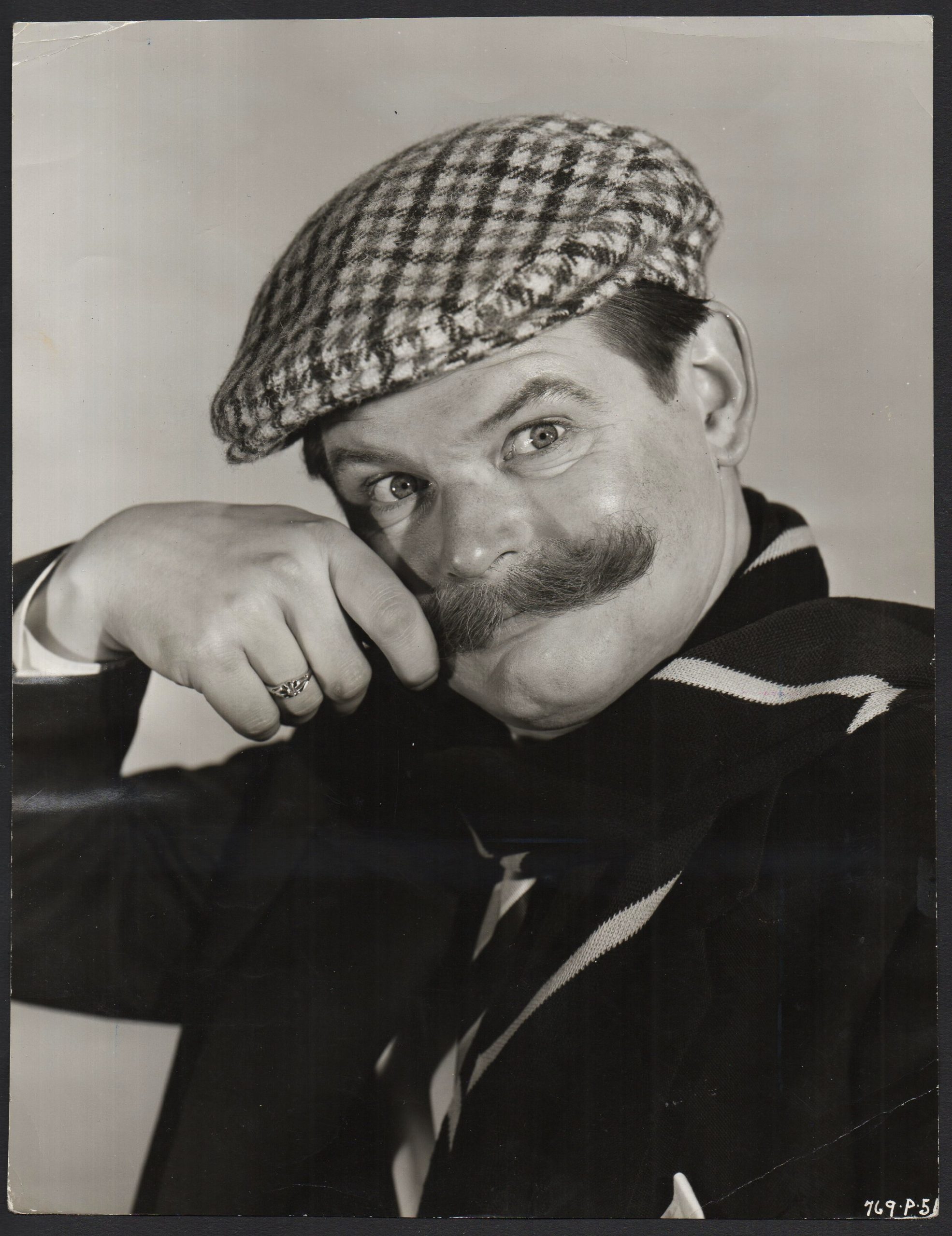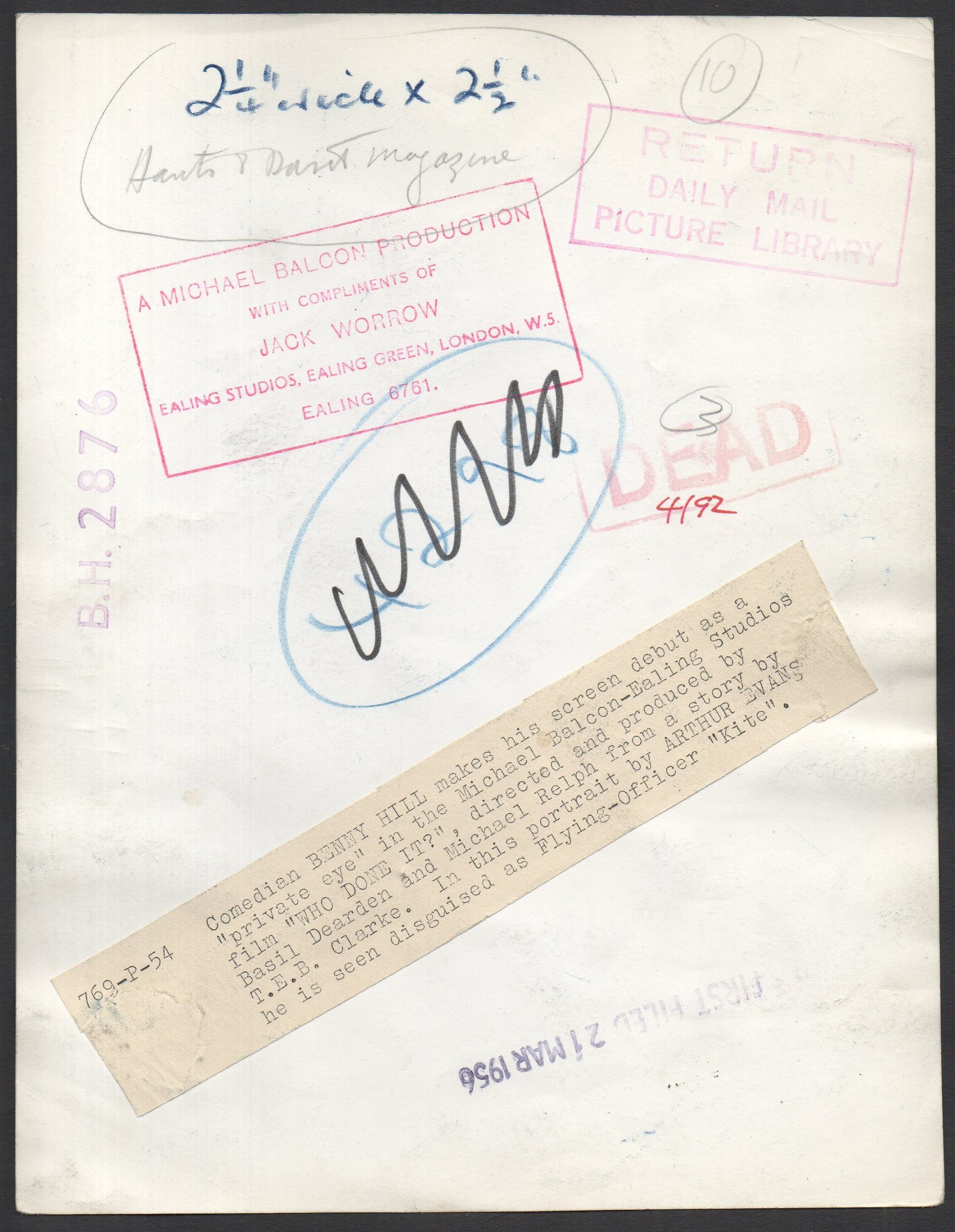 Text attached to reverse: Comedian BENNY HILL makes his screen debut as a “private eye” in the Michael Balcon-Ealing Studios film “WHO DONE IT?”, directed and produced by Basil Dearden and Michael Relph from a story by T.E.B. Clarke. In this portrait by ARTHUR EVANS he is seen disguised as Flying-Officer “Kite”.