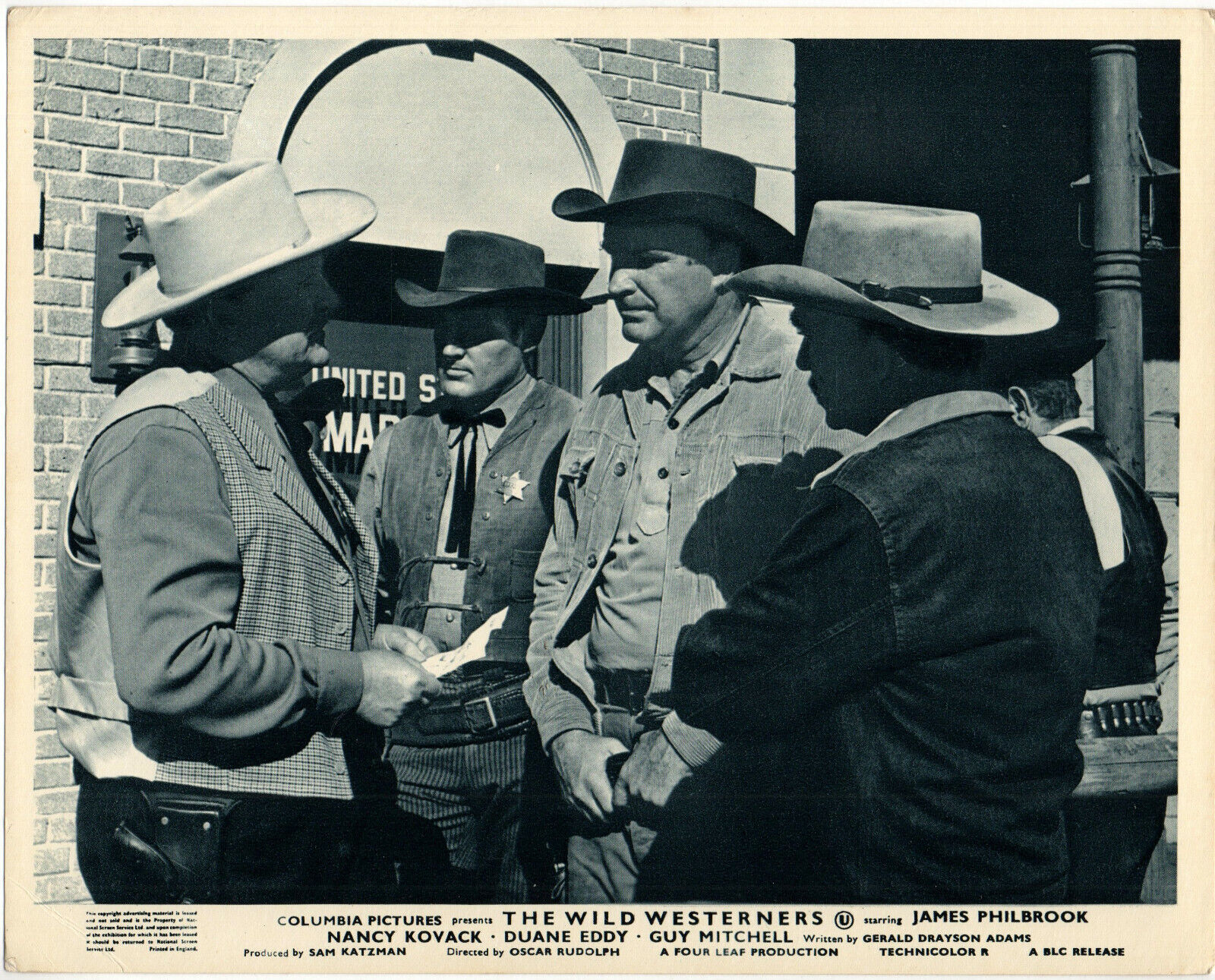 Original black and white 10 inch x 8 inch Front-of-House Still (Lobby Card) of JAMES PHILBROOK & HUGH SANDERS in the 1962 Oscar Rudolph Western THE WILD WESTERNERS