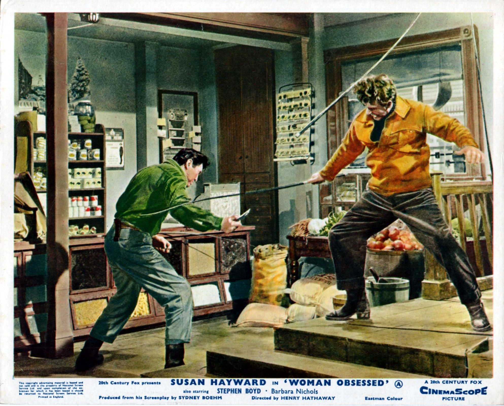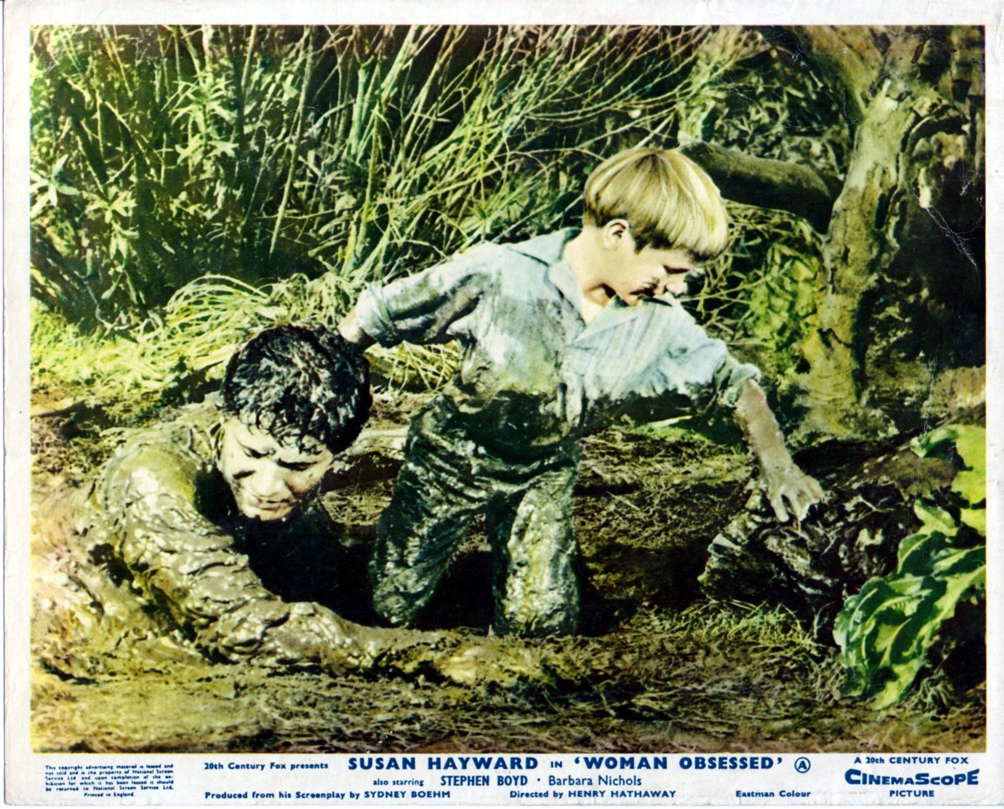 7 Original British 10 inch by 8 inch Front-of-House Stills (Lobby Cards) for the 1959 Henry Hathaway Drama WOMAN OBSESSED, based on the novel by John Mantley and starring Susan Hayward, Stephen Boyd, Barbara Nichols, Dennis Holmes, Theodore Bikel, Ken Scott, James Philbrook and Florence MacMichael.