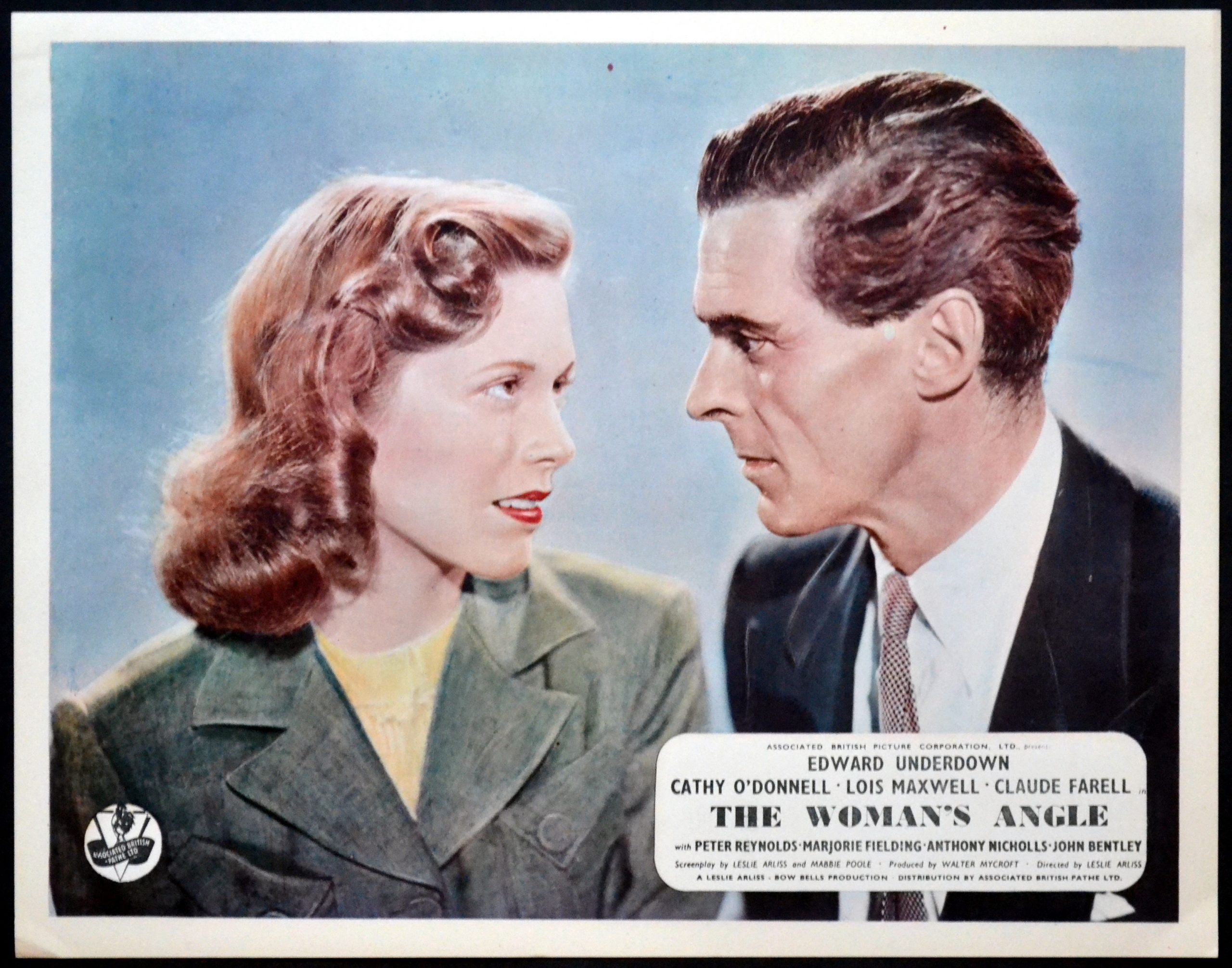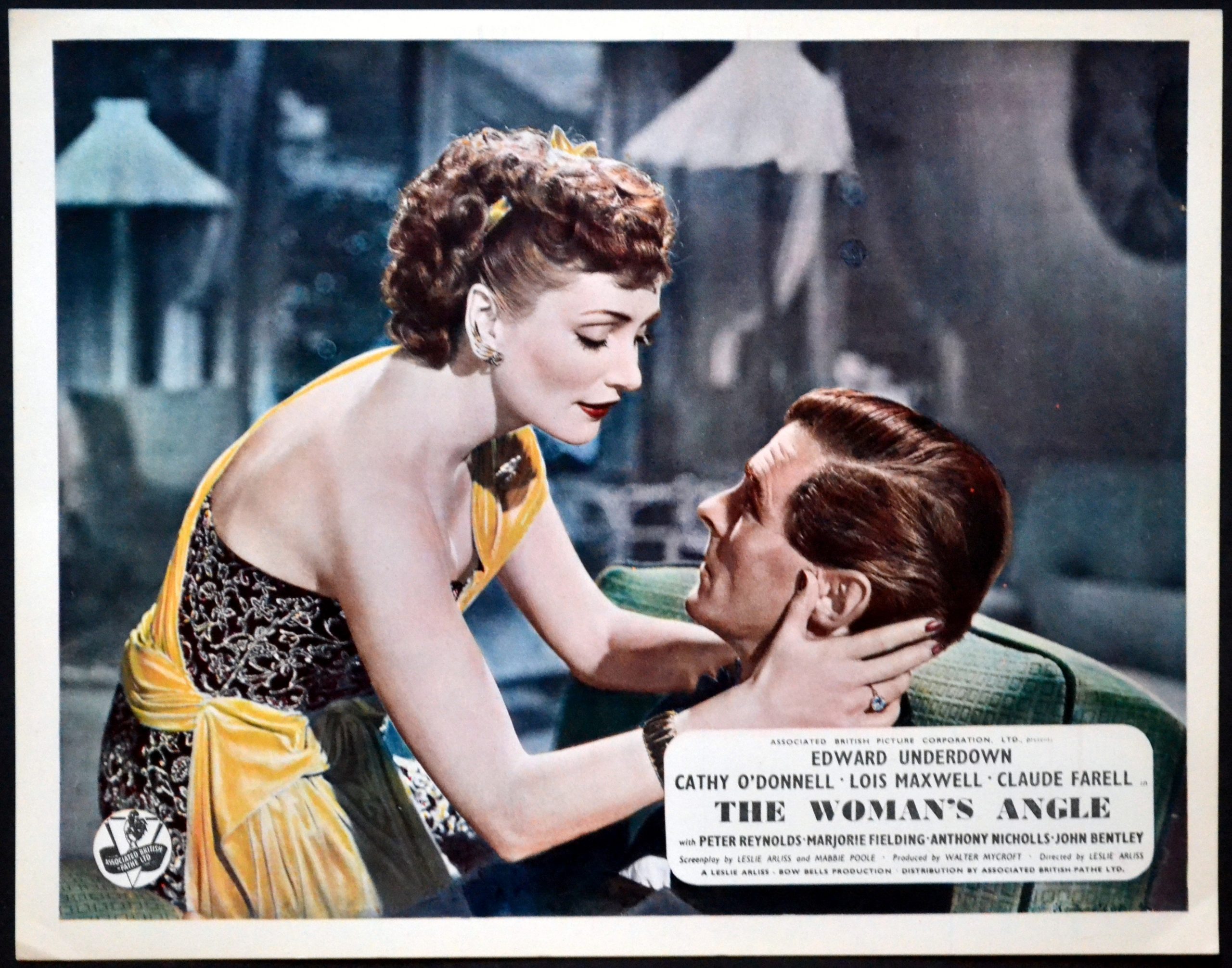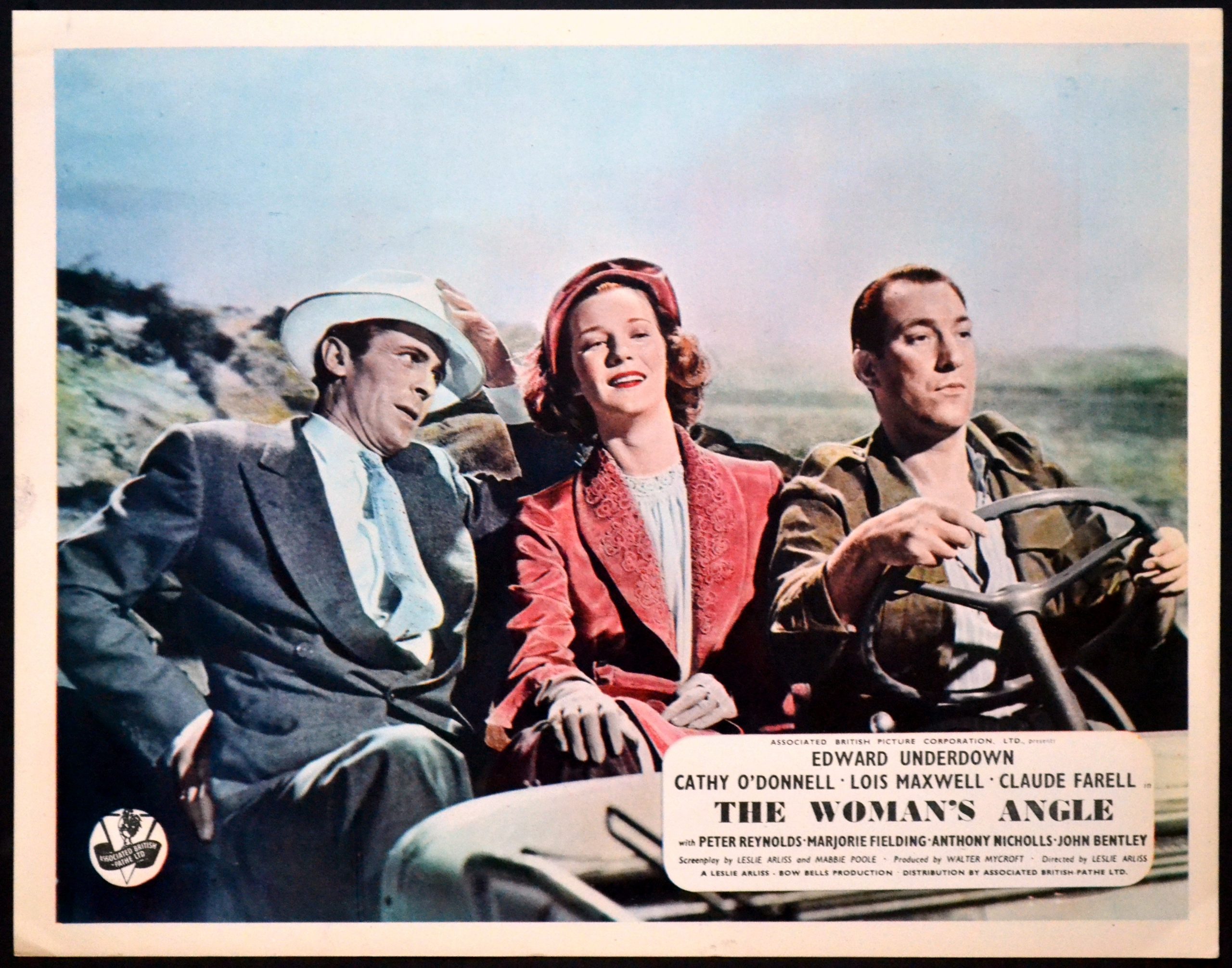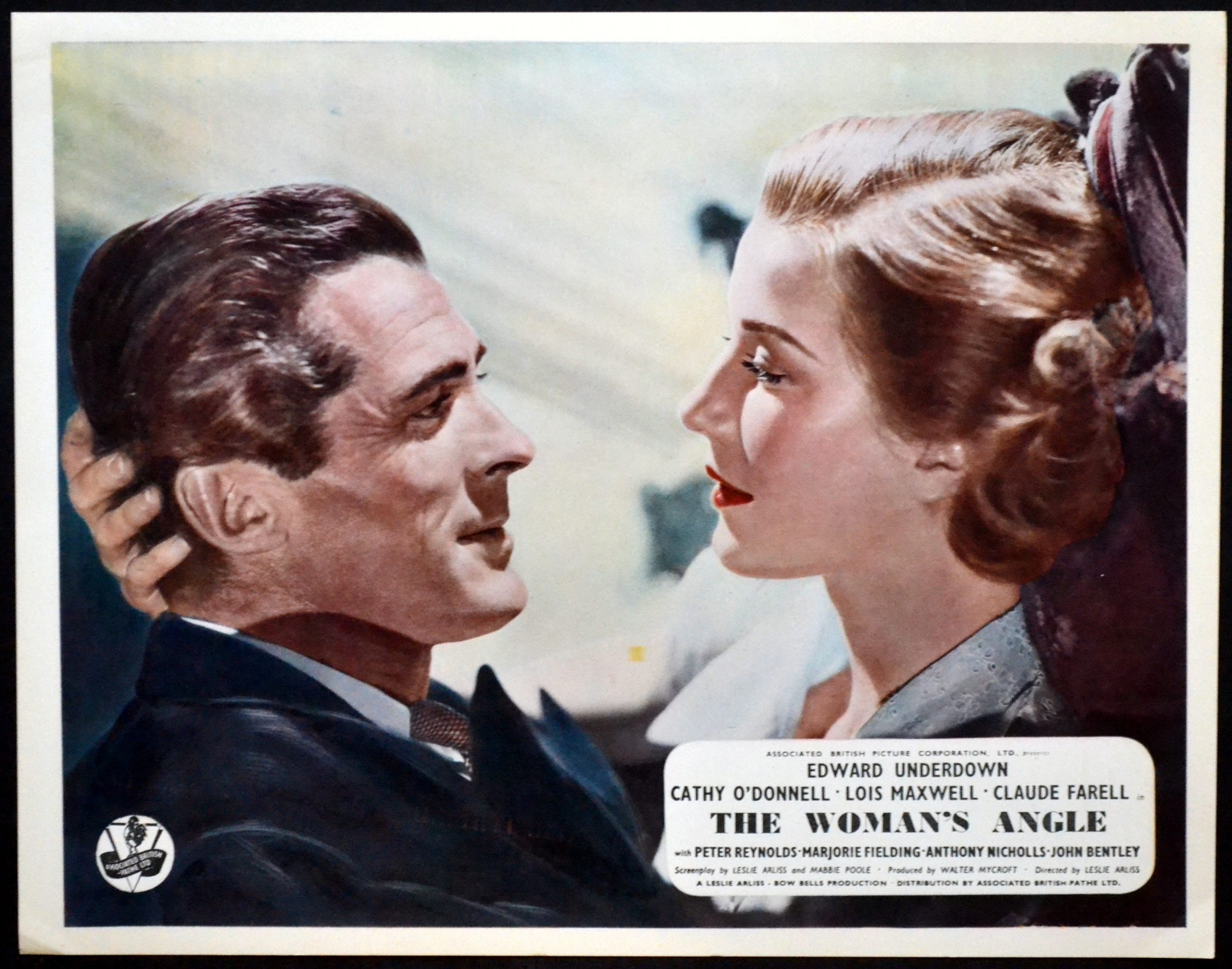 Original British Set of 8 11 inch x 14 inch Lobby Cards for the 1952 Leslie Arliss Drama THE WOMAN’S ANGLE, based on the novel by Ruth Feiner and starring Edward Underdown, Cathy O’Donnell, Lois Maxwell, Claude Farell, Peter Reynolds, Marjorie Fielding, Anthony Nicholls, John Bentley, Isabel Dean, Olaf Pooley, Ernest Thesiger, Eric Pohlmann, Joan Collins, Dana Wynter, Geoffrey Toone, Anton Diffring, Miles Malleson and Peter Illing.