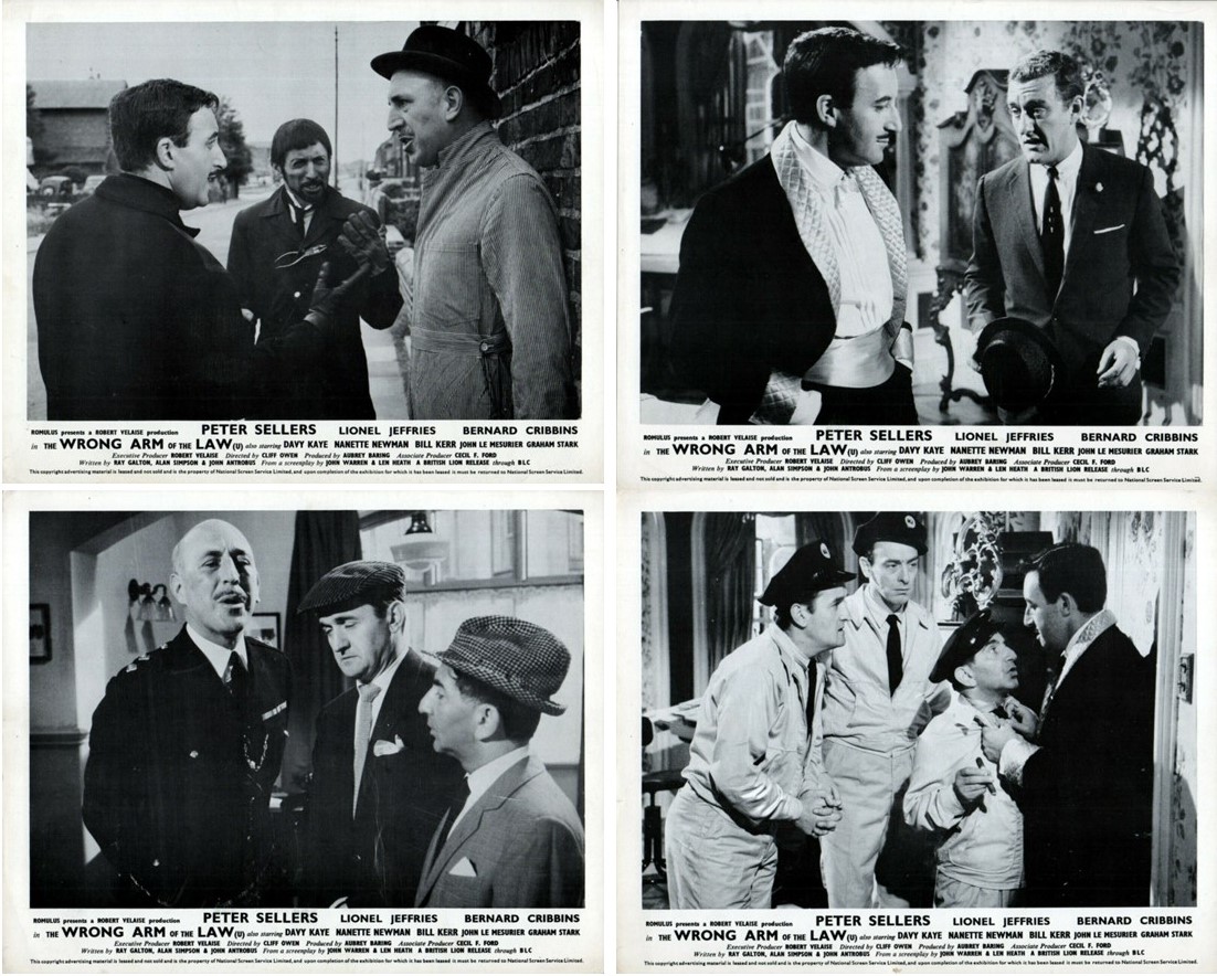 4 Original British 10 inch by 8 inch Front-of-House Stills (Lobby Cards) for the 1963 Cliff Owen Comedy THE WRONG ARM OF THE LAW, written by Ray Galton, Alan Simpson & John Antrobus and starring Peter Sellers, Lionel Jeffries, Bernard Cribbins, Nanette Newman, Davy Kaye, Bill Kerr, Ed Devereaux, Reg Lye, John Le Mesurier, Graham Stark, Martin Boddey, Irene Browne, Arthur Mullard, Marianne Stone, Tutte Lemkow and John Junkin..