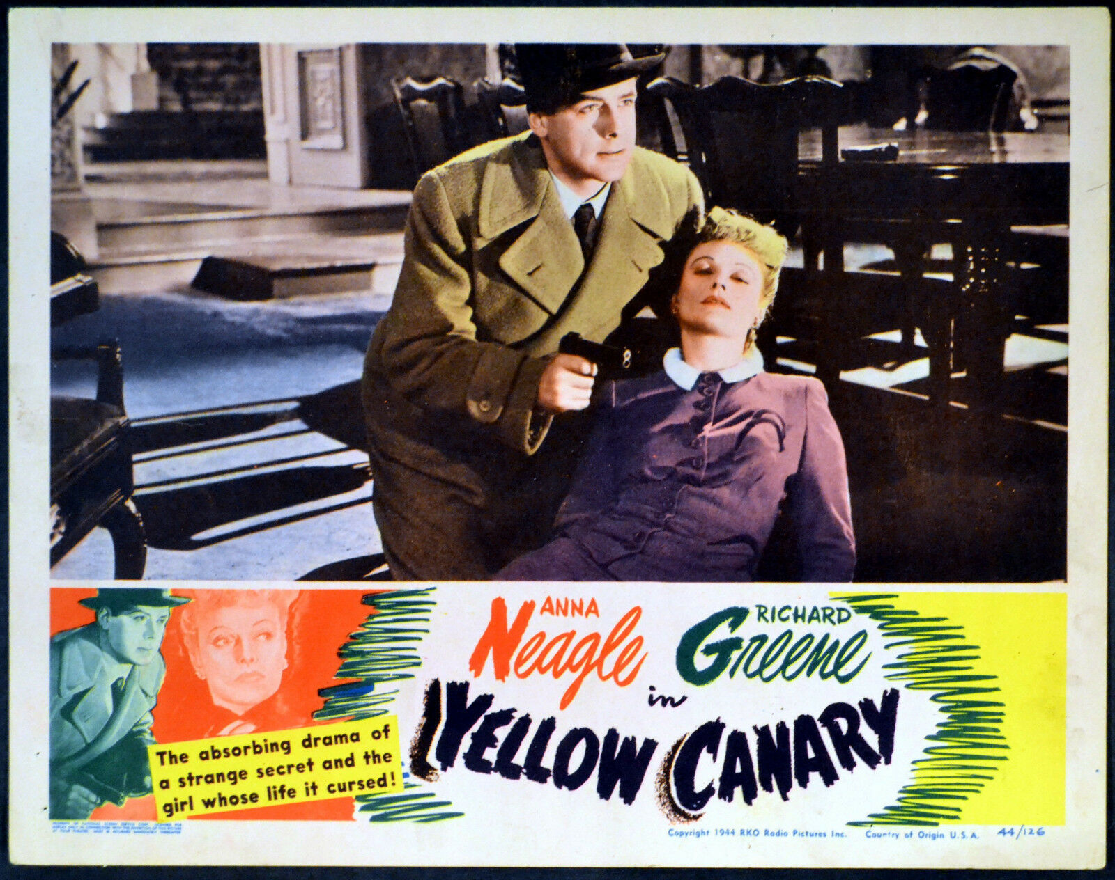 Original U.S. 11 inch x 14 inch Lobby Card of ANNA NEAGLE & RICHARD GREENE in the 1944 Herbert Wilcox Thriller YELLOW CANARY