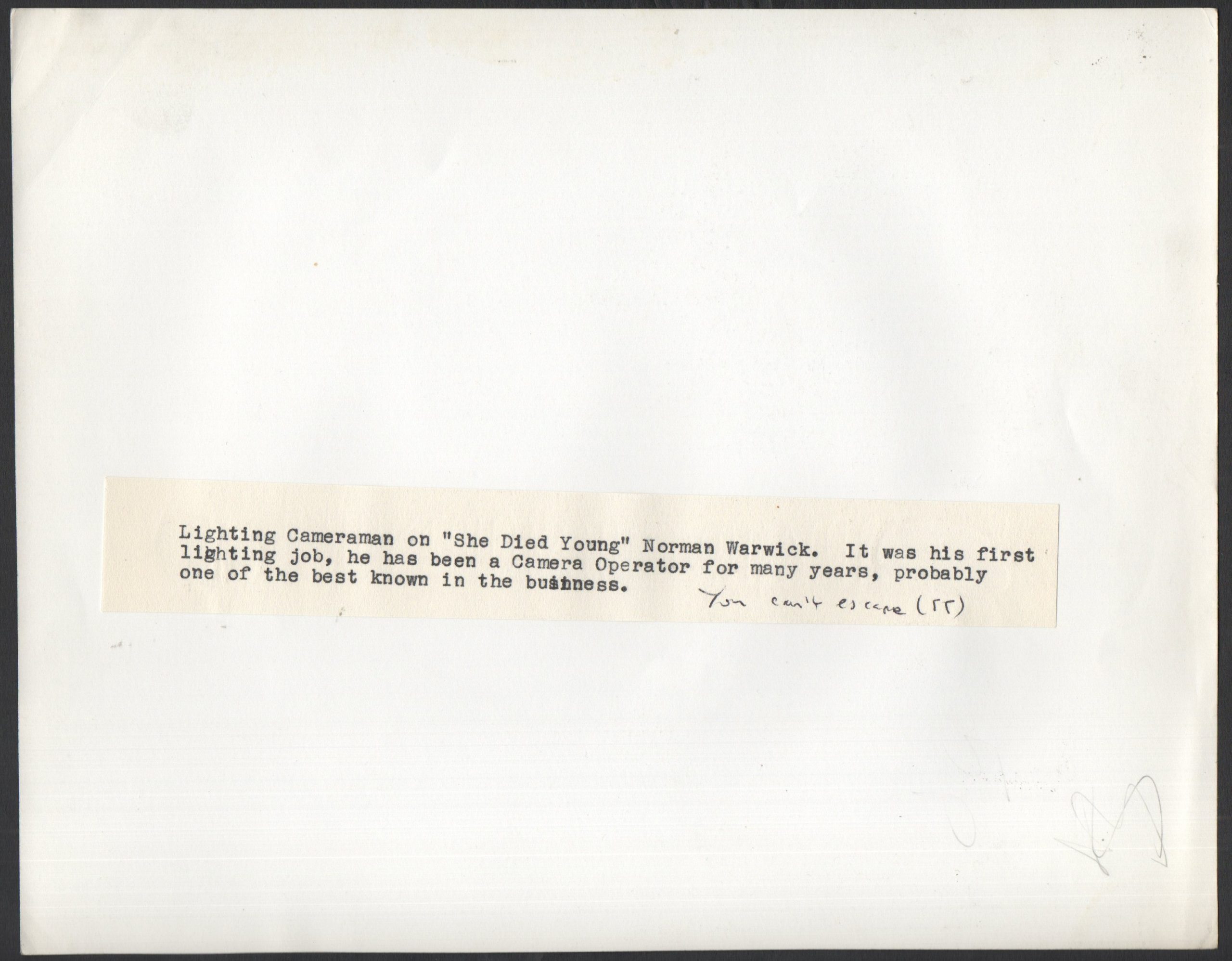 Original 10 inch x 8 inch Still of cinematographer NORMAN WARWICK on location for the 1957 Wilfred Eades Thriller YOU CAN’T ESCAPE, based on the novel by Alan Kennington and starring Noelle Middleton, Guy Rolfe and Robert Urquhart.