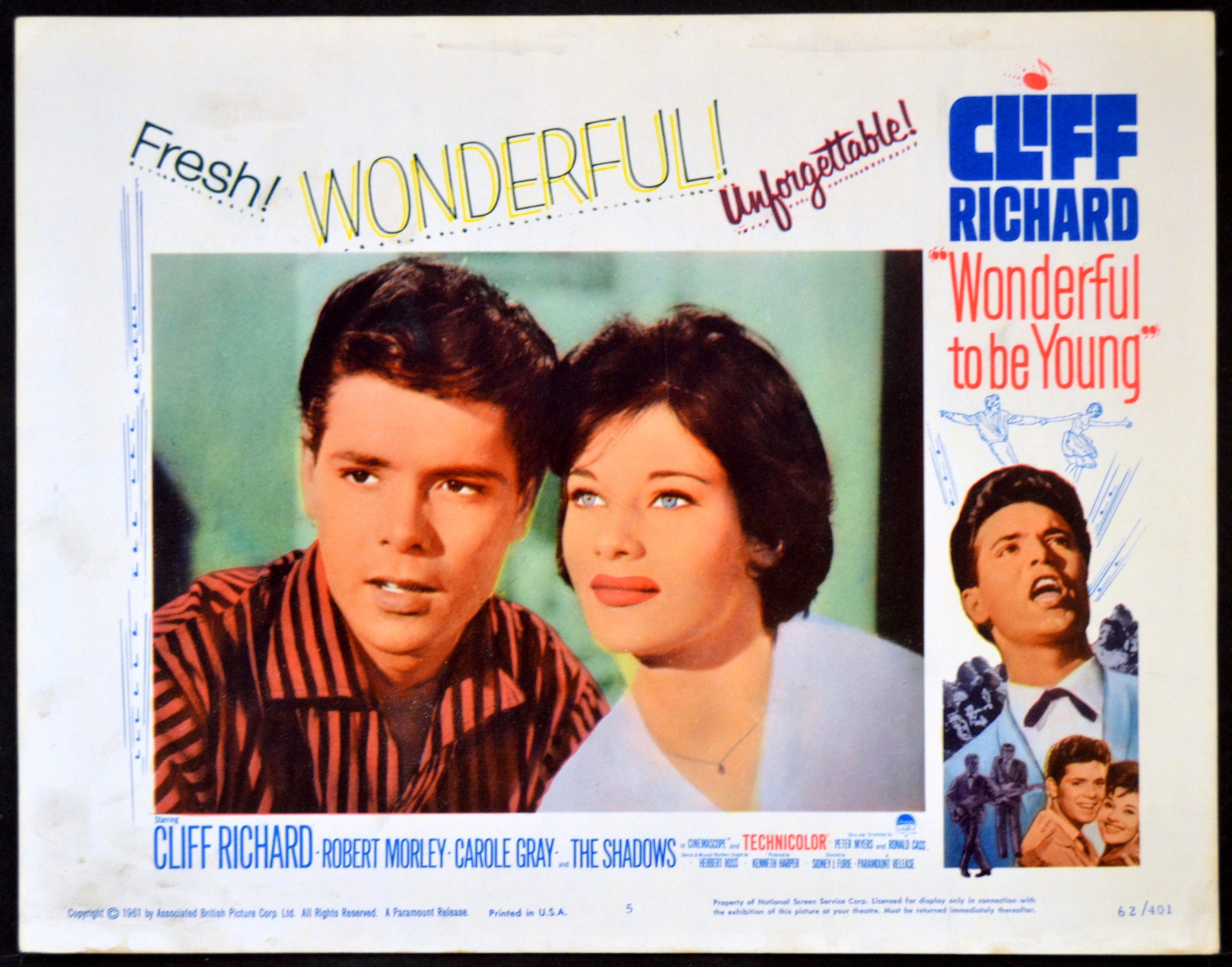 Original 1962 11 inch x 14 inch U.S. Lobby Card #5 for the 1961 Robert Stevenson Walt Disney Comedy THE YOUNG ONES, written by The Gordons and starring Cliff Richard, Robert Morley, Carole Gray, Jet Harris, Hank Marvin, Bruce Welch, Teddy Green, Richard O’Sullivan, Melvyn Hayes, Annette Robertson, Robertson Hare, Sonya Cordeau, Tony Meehan, Sean Sullivan Harold Scott, Gerald Harper and Rita Webb.