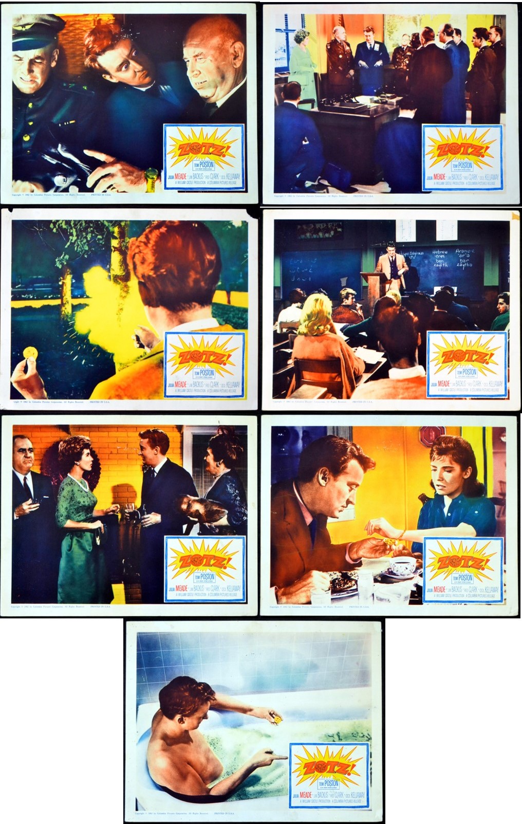 7 Original 11 inch x 14 inch U.S. Lobby Cards for the 1962 William Castle Fantasy ZOTZ!, based on the novel by Walter Karig and starring Tom Poston, Julia Meade, Fred Clark, Jim Backus, Cecil Kellaway, Margaret Dumont, Mike Mazurki and William Castle.